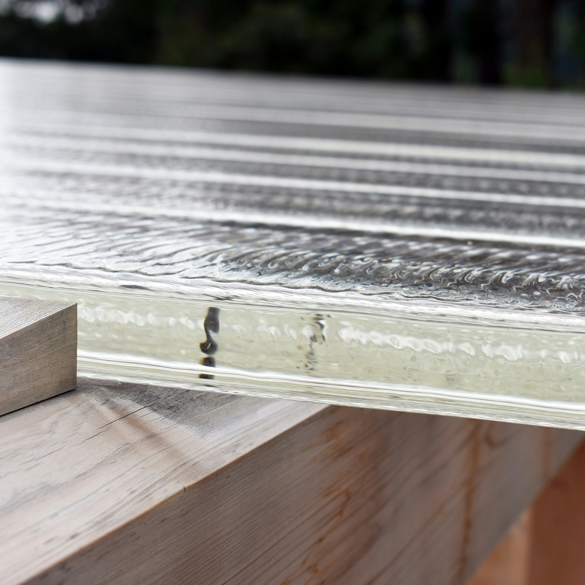 そしてその奥に佇むのが、この施設でもっとも注目すべき「光学硝子舞台と古代ローマ円形劇場写し観客席」だ。冬至の日の出の軸線に合わせてつくられた約70メートルの隧道(「冬至光遥拝隧道」)に沿うように設計されたこの舞台は、檜の土台の上に杉本が多用する光学硝子を敷き詰めたもの。