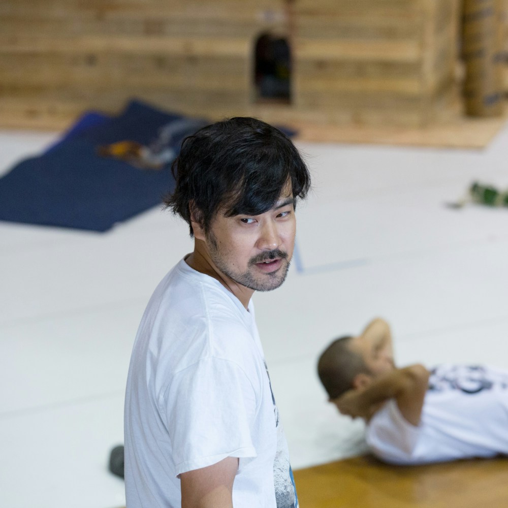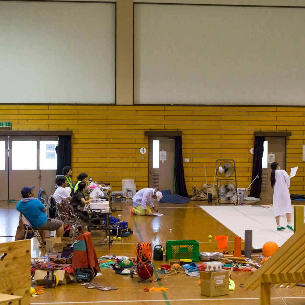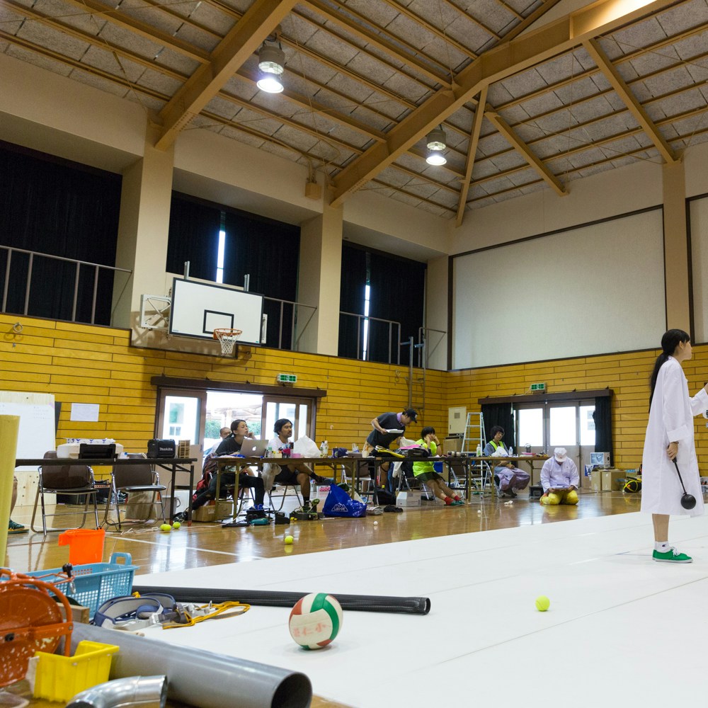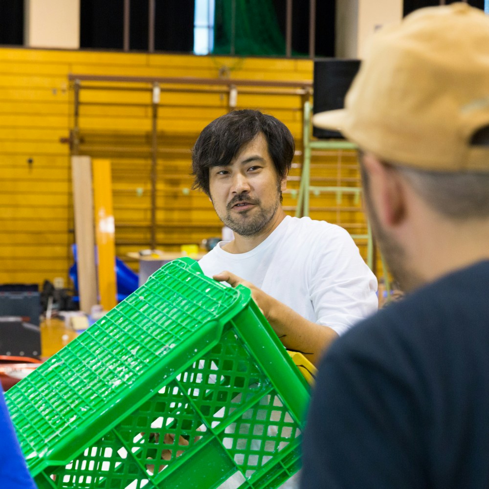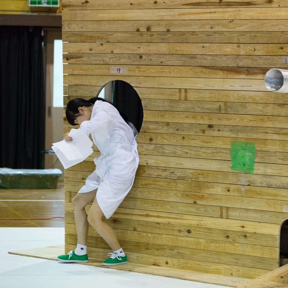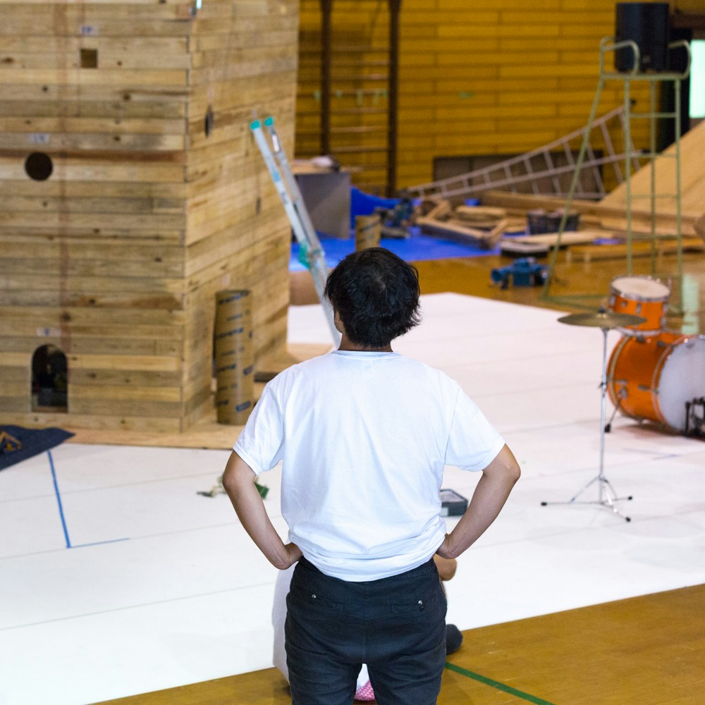 京都駅西に位置する旧崇仁小学校体育館が、『tower(THEATER)』の稽古場。お隣りのグラウンドでは地元の少年野球チームが練習する、なんとものんびりした雰囲気のなか、本作の稽古は続いている。そもそも『tower(THEATER)』とはいかなる作品なのか? KEXのホームページでは、すでに金氏が書き下ろした「『tower(THEATER)』に関する覚え書き」が公開されている。そこで「舞台上に約6メートルの、大小いくつもの孔の空いた、抽象的な建築物」と述べられているように、舞台中央には巨大な矩形の「タワー」がそびえ立ち、それによって誘発された、あるいはタワー自体を奮い立たせるかのようなアクションが次々と起こる、というのが補作の骨子である。そして、それらのアクションを起こす人々がとにかく豪華だ。