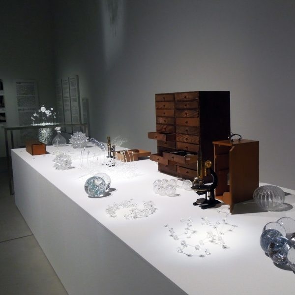 続く「脳の中の森—南方熊楠の発見方法」のセクションでは、人間の心に野生状態を取り戻すことで新しい科学的方法を生み出そうとした明治時代の博物学者・南方熊楠の「世界の探求方法」を紹介。熊楠が実際に使用していた道具とともに、粘菌などをモチーフにしたガラス細工を並べる青木美歌の作品や、熊楠が研究に取り入れた仏教の概念「縁起」を視覚化したaircordの作品などが展示される。