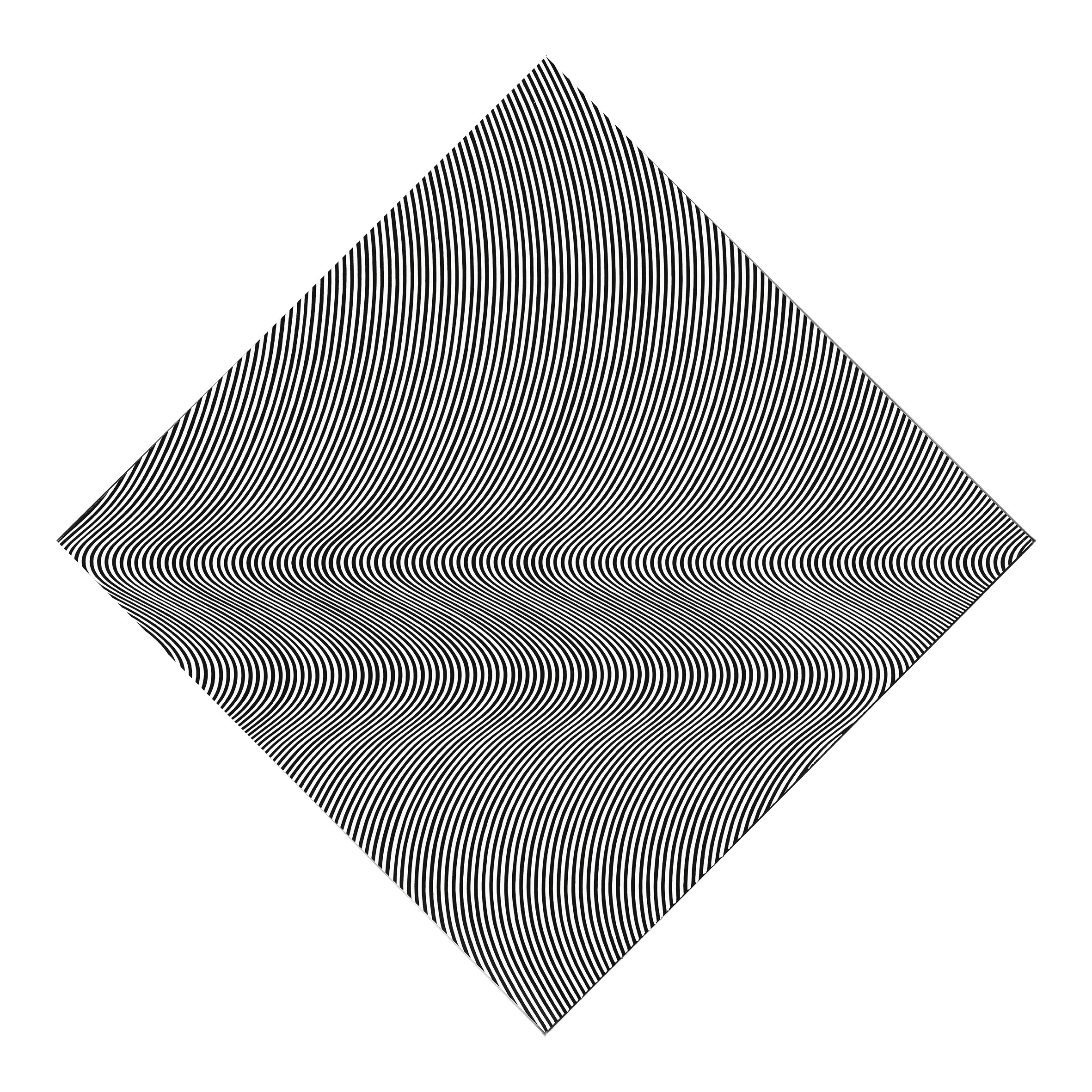 マルセル・デュシャンの「オプ・アートはまさに網膜的である」という言葉がふと脳裏をよぎる。この発言がなされた1966年は、錯視効果に焦点を当て、ライリーの作品もまた中心的に取り上げられた展覧会「レスポンシヴ・アイ(応答する眼)」がニューヨーク近代美術館で開催された翌年であった。デュシャンは絵画が「網膜的」であることを批判し、「頭脳的」であるべきだと説いたが、しかし「オプ(ティカル)・アート」(「ポップ・アート」に掛けられている)と呼ばれたライリーの絵画は、いわゆる錯視効果と自然に結びつく「網膜的」という範疇にとどまるものではない。むしろ、その緻密に調整されたかたちから感知される絵画空間のうねりによって、網膜と頭脳は直結し、互いに振動する。デュシャンが1920年代より行っていた、線形を回転させ、立体的な錯視効果をもたらす光学実験は、作品をレディメイドと同様、芸術の枠組みにとどまらず産業技術のそれへとずらす意図を持ち、それらは(彼自身の監修のもと)59年には「精密光学(Precision Optics)」とカテゴライズされていた。そもそも、彼による絵画の描画行為からレディメイドの選択行為への移行をたどるならば、光学理論にもとづきスーラが絵画における筆触を、既製品のチューブ絵具の選択として点描へと移行させていたこととも無関係ではなかった。ライリーの線形は彼女の意図とは違い、服飾などの大量生産品へと転用されたが、何よりもこれらの視覚のコード化と対象の非人間化は同一線上にあり、ともに新しい次元の創出へと向けられていたのである。