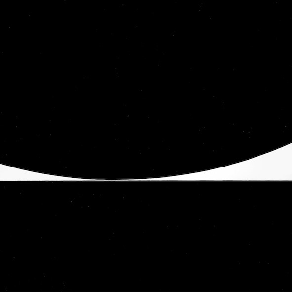 1枚目の絵画《接吻》は、出品作のなかでもっとも古いもののひとつであり、「キス」をするように、画面中央下に引かれた水平線、そこへと落ちてくるような曲線、そしてそれらの線が触れそうで触れない、2つの面が描かれている。これらの要素は、本展の起点となる。「カーブ」と分類された最初の展示では、白と黒の線が波打ち、織り成された面と、それらに加えられた灰色がなだらかに色彩へと変化し、「ゆらぎ」をもたらす。線が連続することで生まれる面、という2つの次元は、ライリーの絵画を形成するものにほかならない。そしてその線形の前で鑑賞者は、モアレのように目の中でうごめく、もうひとつの極薄い次元を「視る」ことになる。線形の反復は平面の外側でちらつき、わずかながら立体的に浮かび上がってくる。