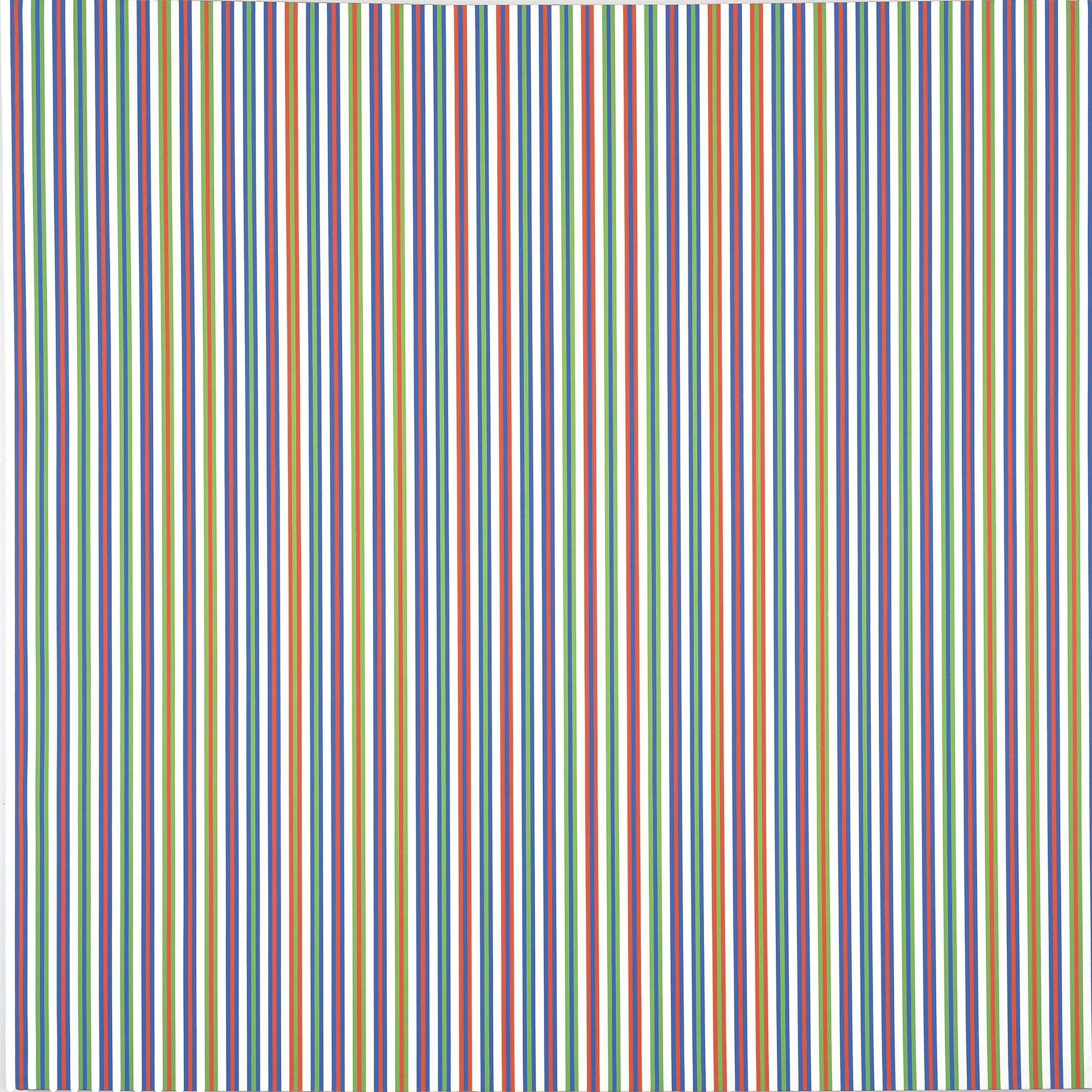 ライリーは、スーラが探求した目の中で色彩が混じり、原色の鮮やかさをもたらす視覚混合の光学理論をラディカルに発展させた。「ストライプ」と分類された次の展示では、水平、あるいは垂直方向へと伸びていく色彩の帯が、その順序を入れ替え、分離したまま反応し合う。ここでも線形は、視覚のなかで混じり「ゆらぎ」となるが、そうした生体反応の向こうで隣接する色彩の共鳴をとらえるならば、記号となったスコアからのように、分離—結合される色の歌を「聴く」ことになる。ライリーの絵画は、網膜の上に光を集め、その線形のパターンは肉体の内側にまで強く響き、まぶたの裏側を呼応させる。