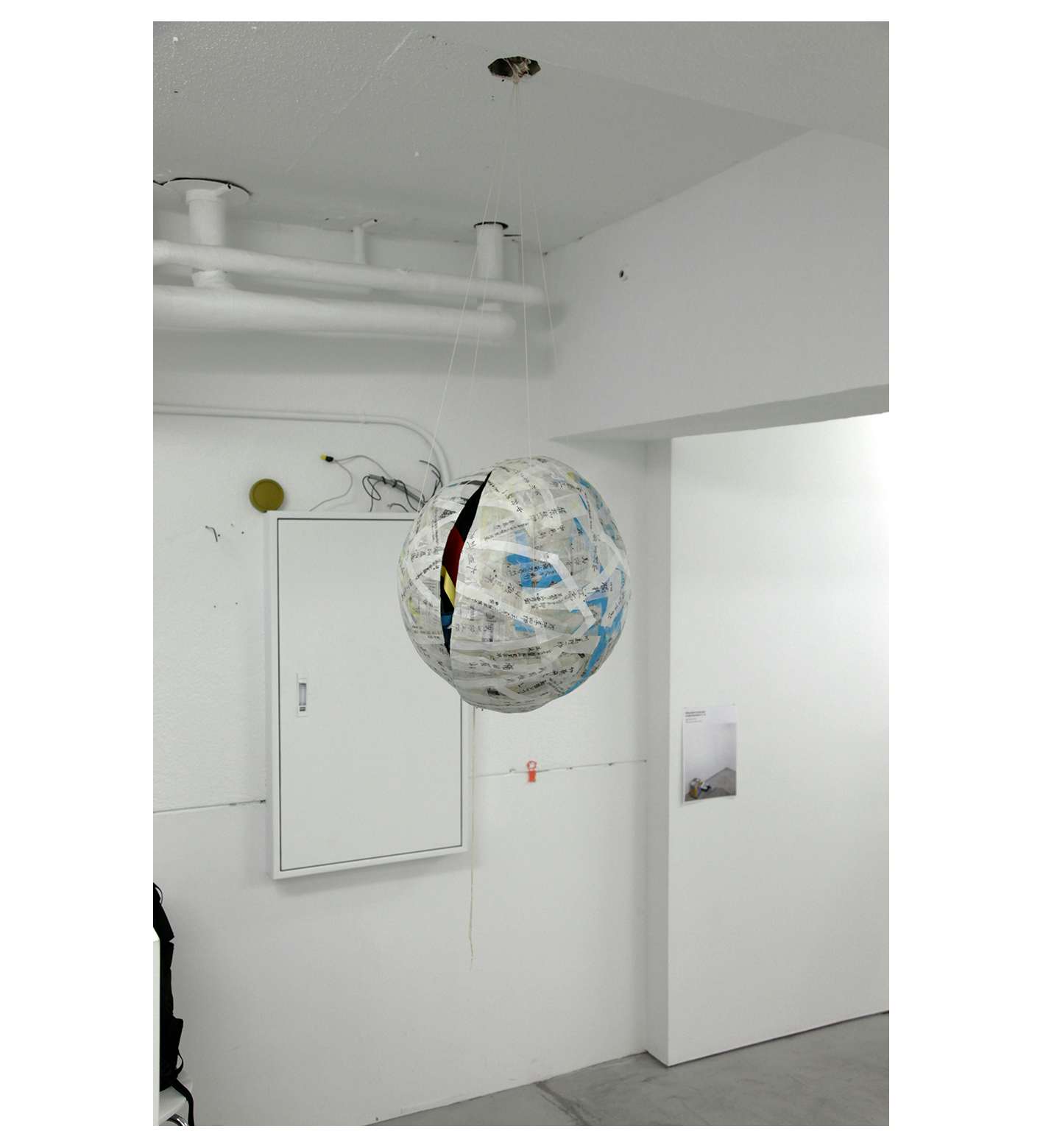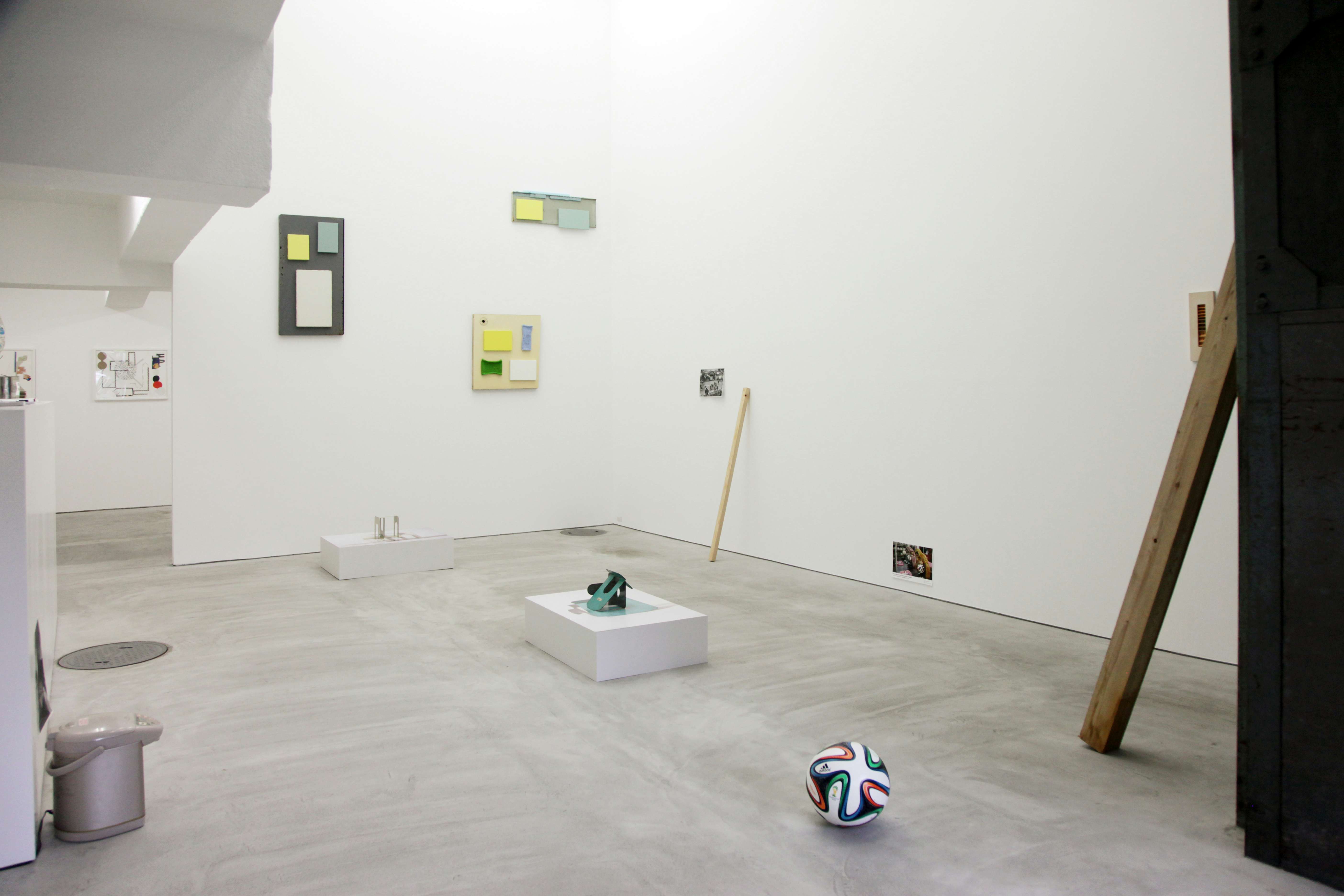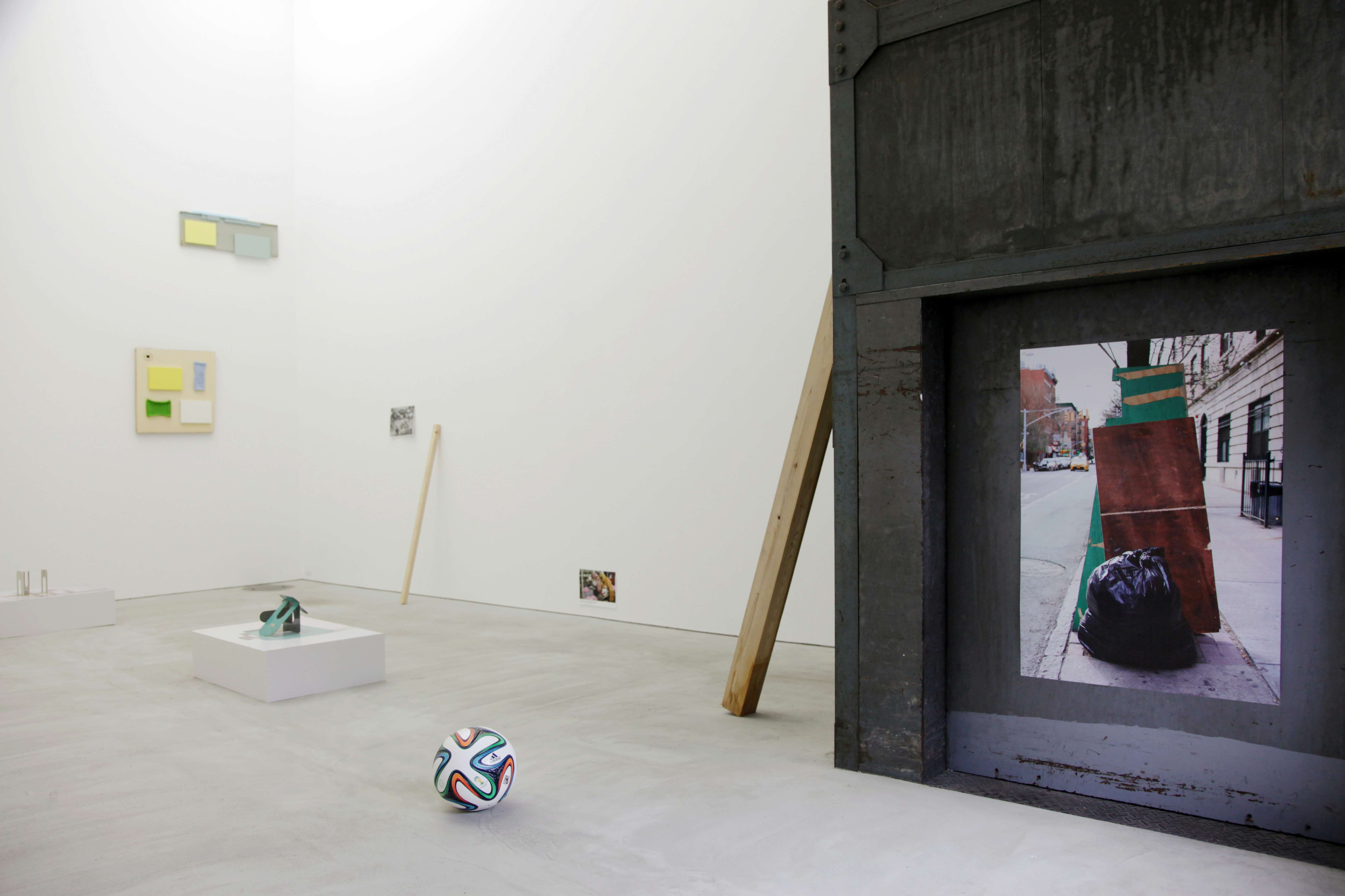 展示風景より手前のサッカーボールと奥の写真作品が橋本聡《サッカーボールとその過程》(2018)、手前の写真作品が冨井大裕《ゴミ写真#42》(2015)