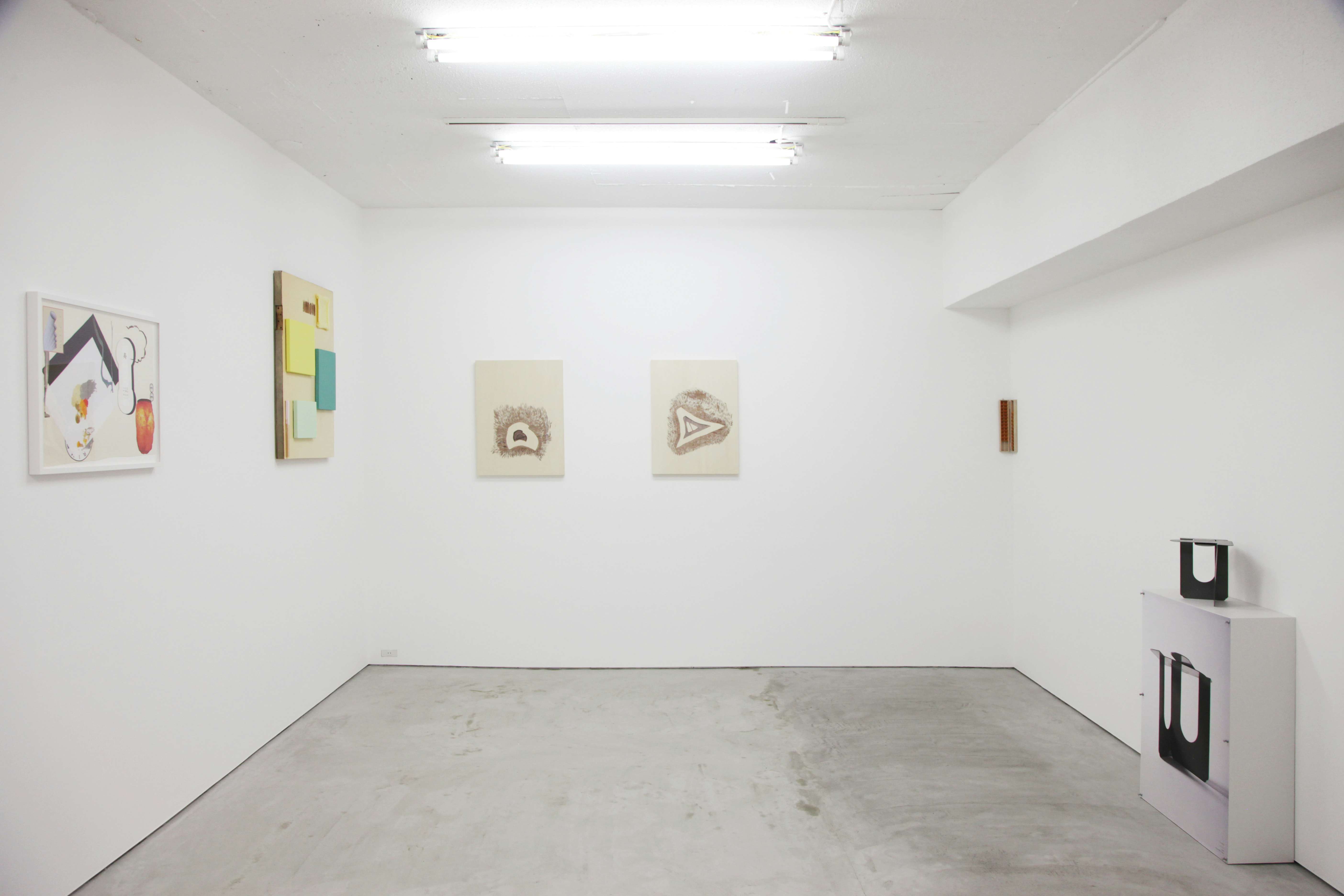 展示風景より左から麻生晋佑《Untitled》(2016)、白川昌生《Coyote#24》(2018)、中央が豊嶋康子《マウント_分度器》、《マウント_三角定規》(いずれも1996-2018)、右が奥から豊嶋康子《串刺し-2》(2018)、冨井大裕《LION》、《LION(ポスター)》(いずれも2018)
