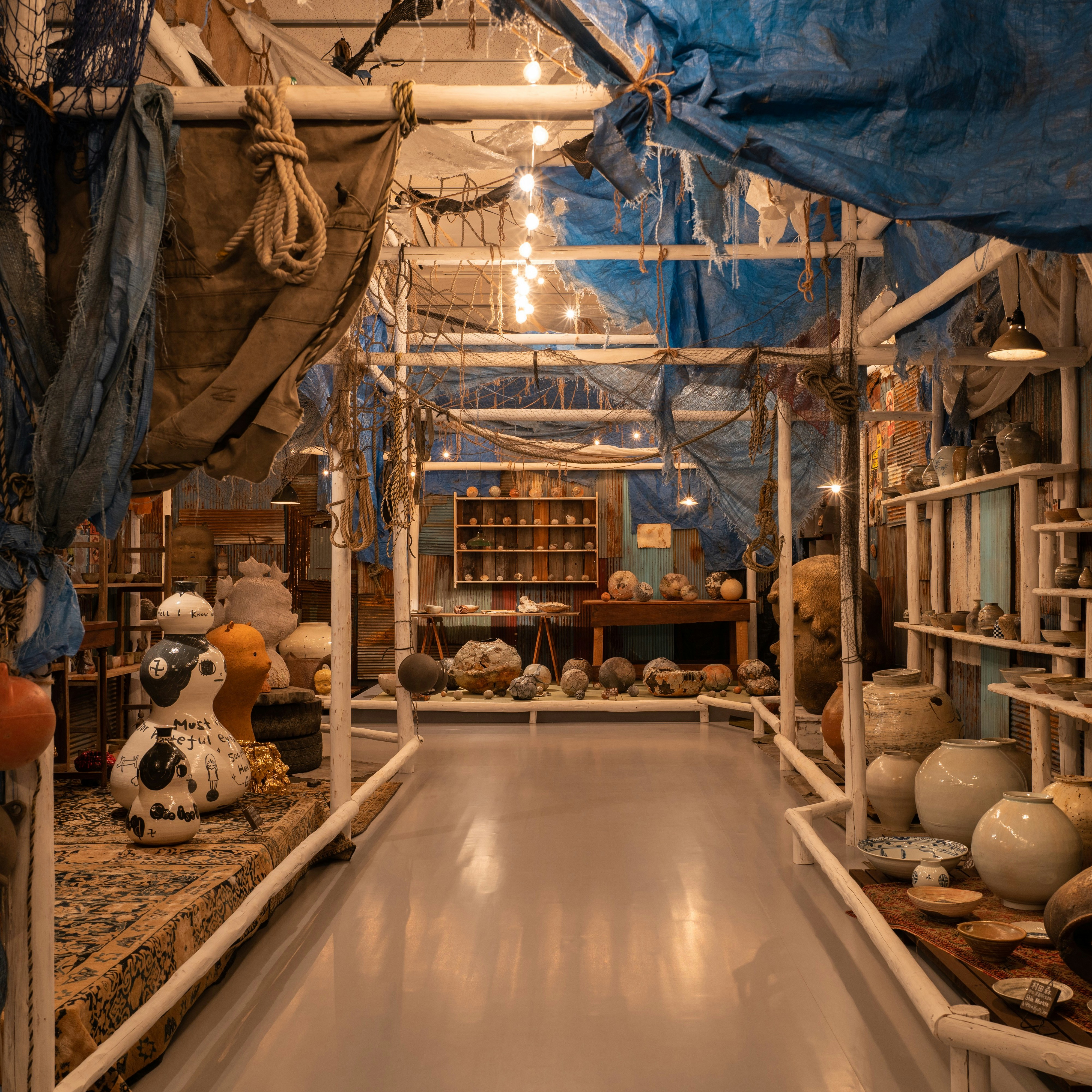 戦後を再考するはずの本展では、もはや戦前に『機械化』(1940〜1945)のイラストによって人気を博した小松崎茂の原画までもが持ち込まれ、庵野秀明、成田亨らと接続されているし、本展で明らかにターニングポイントとして空間化されているのは東日本大震災である(指差し作業員は、まさに本展のターニングポイントを指差している)。指差し作業員が指さす「3.11」以降の社会には、1800点もの現代陶芸が所狭しと並べられ、その空間を抜け出た後には、もはや岡﨑乾二郎も、榎倉康二も、李禹煥も、菅木志雄も、骨董未満の小道具たちと等価な場が出現する(岡崎の作品が本展において前半と後半の2回出てくることは示唆的である)。