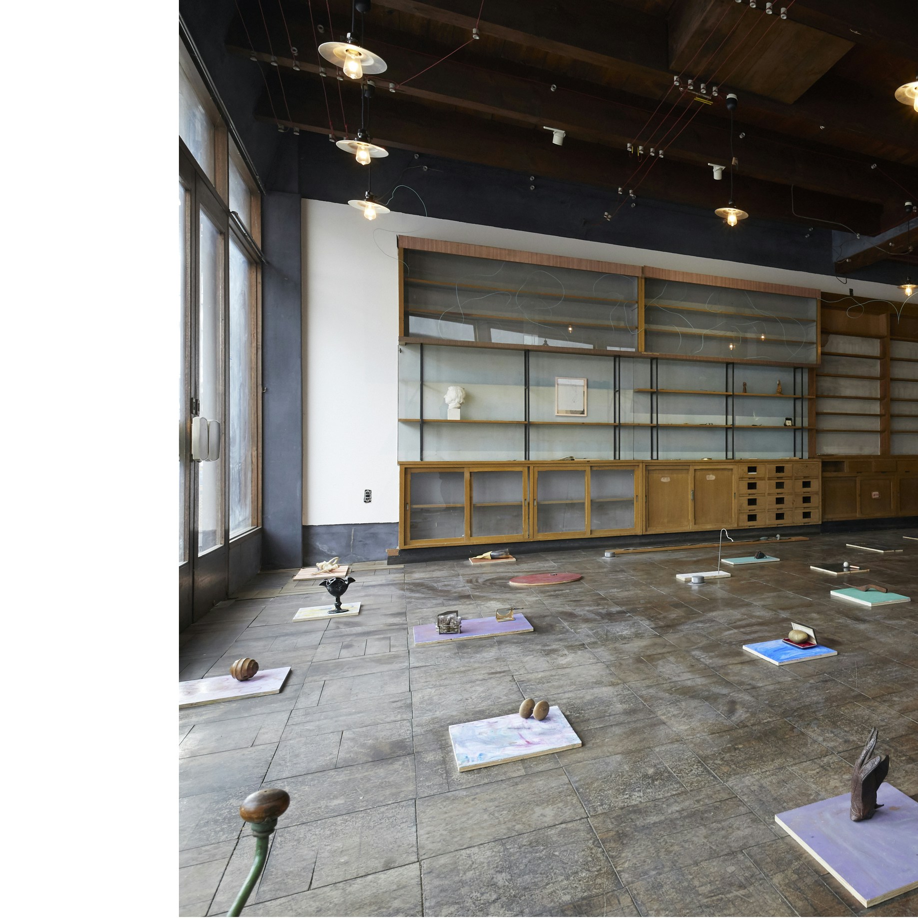 白い霧を抜け、日光東照宮にほど近い建物のドアをくぐる。もともと薬局だったという年季の入った板張りの床に、それぞれに色彩が重ねられた木の板が並ぶ。その上には古びた時計や使い道のわからない民芸品、金属の器具などが絵画の一部のように配置され、鈍い光沢を放つ。