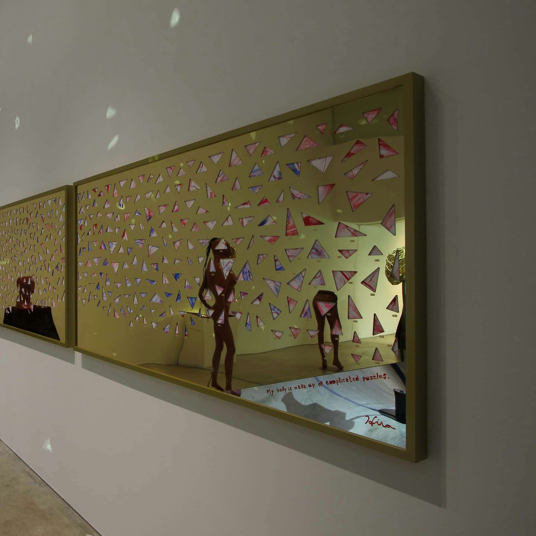 それに比べミヅマアートギャラリーの展示では、無骨なコンクリートの床にポツポツと展示されるジュエリーが、入り口を通り抜けた瞬間に目に入る。《エンゲージド・ボディ:身体のミラーボール》が反射させる三角形の光によって緩やかにジュエリーたちは部分でありつつも身体全体を紡ぎ出し、新作の平面作品《私の身体は複雑なパズルでできているの》のナンバリングされた身体の部分、もしくはプレパラートに広げられた細胞株の三角形と呼応するかたちで、体の部分と全体をつなぎ合わせていた。ゴージャスさは減ったが、そのことで、恵比寿映像祭では部屋全体の印象に回収されて目が行き届かなかった細部まで意識が向けられた。
