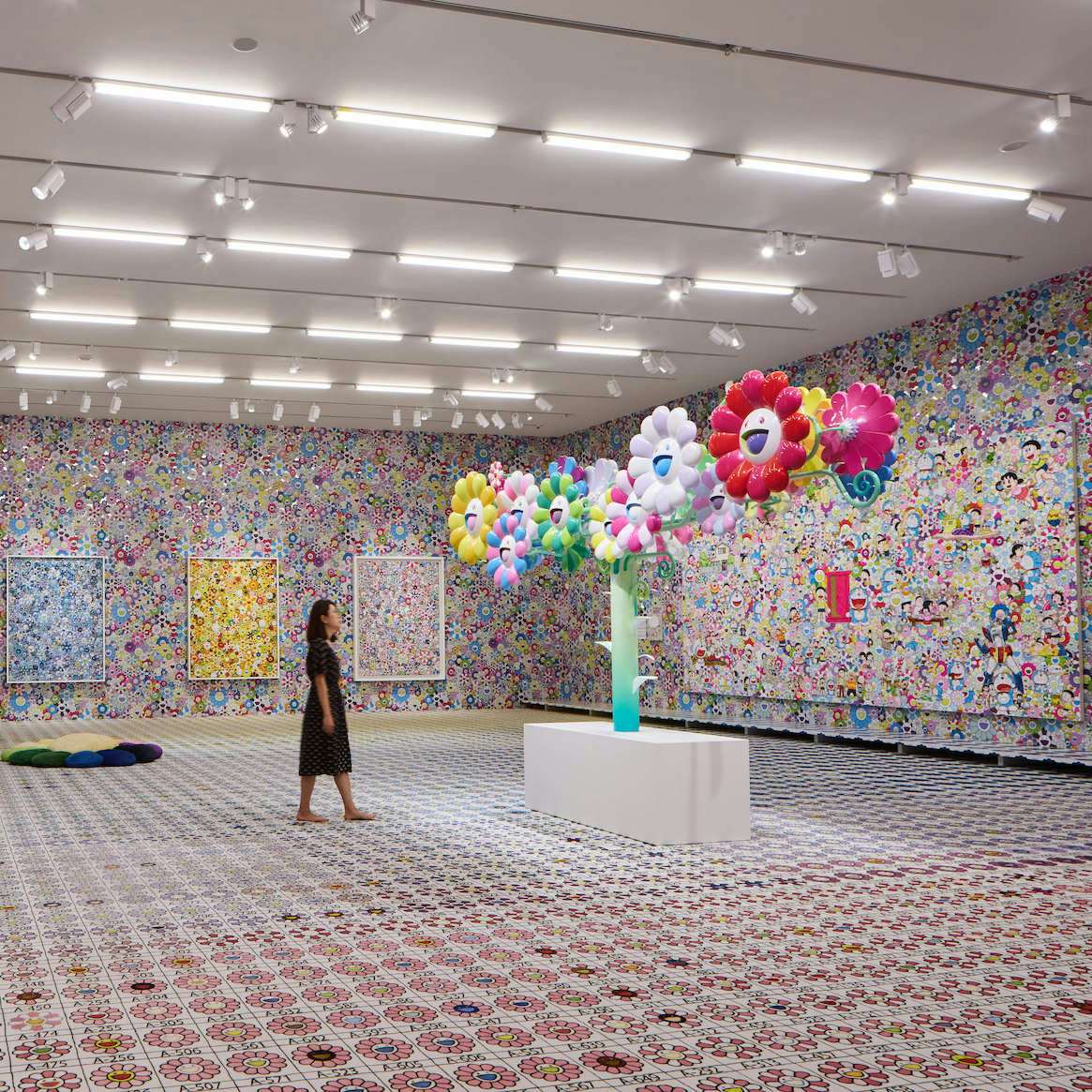 だが、やはり圧巻なのは、3階、1階、そして特別展示室に分けられた巨大な三つの空間だろう。この部屋では、いまではもうおなじみと言ってよい村上隆の絵画や彫刻が、まったく異なる仕立てで出されている。というのも、このつの空間で村上は、床から壁のすべてを展示室ごとの趣向で統一し、全面的に貼り替え、部屋全体でひとつのインスタレーションと考えられる空間をつくり出しているからだ。