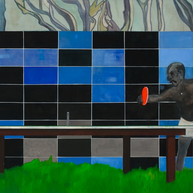 このように三次元と二次元の間を揺れ動くグリッドは、サイズの観点からするとますますあいまいなものとなる。上記の3点でわたしたちがグリッドを一応ビールケースやレンガと判断するのは、手前に立つ人物の大きさとの比較によってである。しかし3点にはどれも意図的に地面が描かれていない(《ピンポン》の地面は奇妙な草に覆われ、《花の家(そこで会いましょう)》では人物の足から下が透明になって消え、《馬と騎手》は馬の脚の付け根までしか画面に入っていない)ため、人物とグリッドとの間に開いた距離を確定することはできない。レンガやビールケースと思われているものは、実は人物からかなり遠くにあって、そのためもっと大きなサイズを持つ箱状の物体(たとえばコンテナなど)がいま仮に小さく見えているだけかもしれないのだ。ここでも見る者は、もとのモチーフのサイズを確定できないことの揺らぎ(「想像上のサイズ」)と、目の前の画面に描かれた四角い色面のサイズ(「物理的なサイズ」)とのあいだで引き裂かれる。