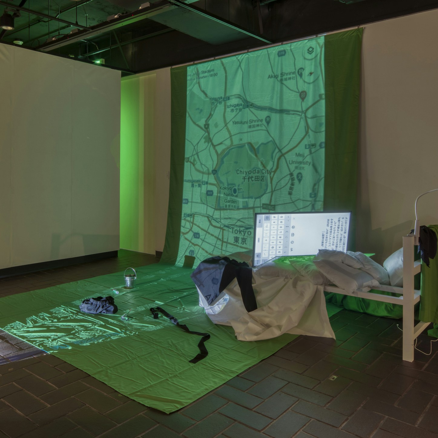 2020年9月13日14時。生中継パフォーマンスは、スクリーンでの映像の上映を停止して始まった。ループ上映されていた映像に登場するホームレスの居場所が中継されているようだ。スピーカーからは、ミズタニらしき女声とホームレスらしき男声の会話が流れてくる。やや乱雑な中継は、明確に聴き取れるわけではないし、どのような文脈の会話なのかしばらくは追えない。先ほどまで、ある意味では誇張のある映像が投影されていたスクリーンに、直の生の映像が映され、見ている僕のなかに乱雑になだれ込んできた感じだった。ただの生中継だが、視聴者が美術館でこれに出会うこと、作品と同じ画面に映し出されることがもたらす違和感、この驚きのなさそうな事態に自分が吸収されたことに驚いた。