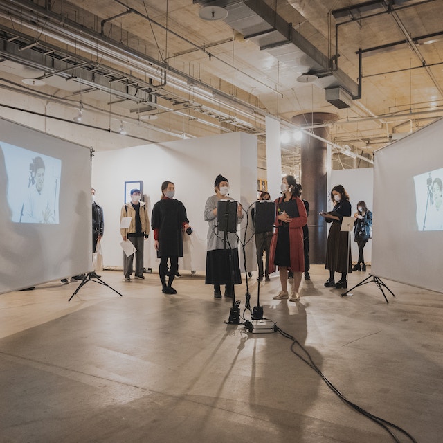 (左から)小泉明郎《笑う》(2017)、グランギニョル未来《グランギニョル未来2020》(2020)、