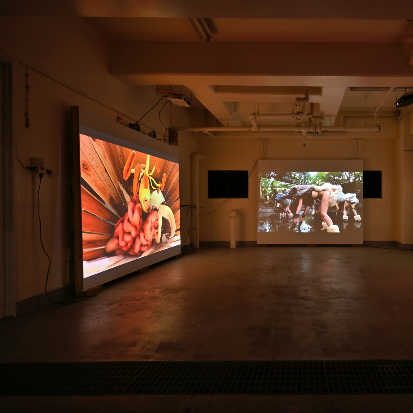 また本展の企画者のひとりである林千歩による3本の映像を同時に上映したインスタレーション(?)は、作者の身体を被写体としてスクリーンに複製しながら、手作りのセットを用いて表現された「花占いによる自問自答」「鏡写しの羊のドリー」「仏像の妊娠」というそれぞれの主題によって、生命についてのトートロジカルで遊戯的な領域をつくり出している。