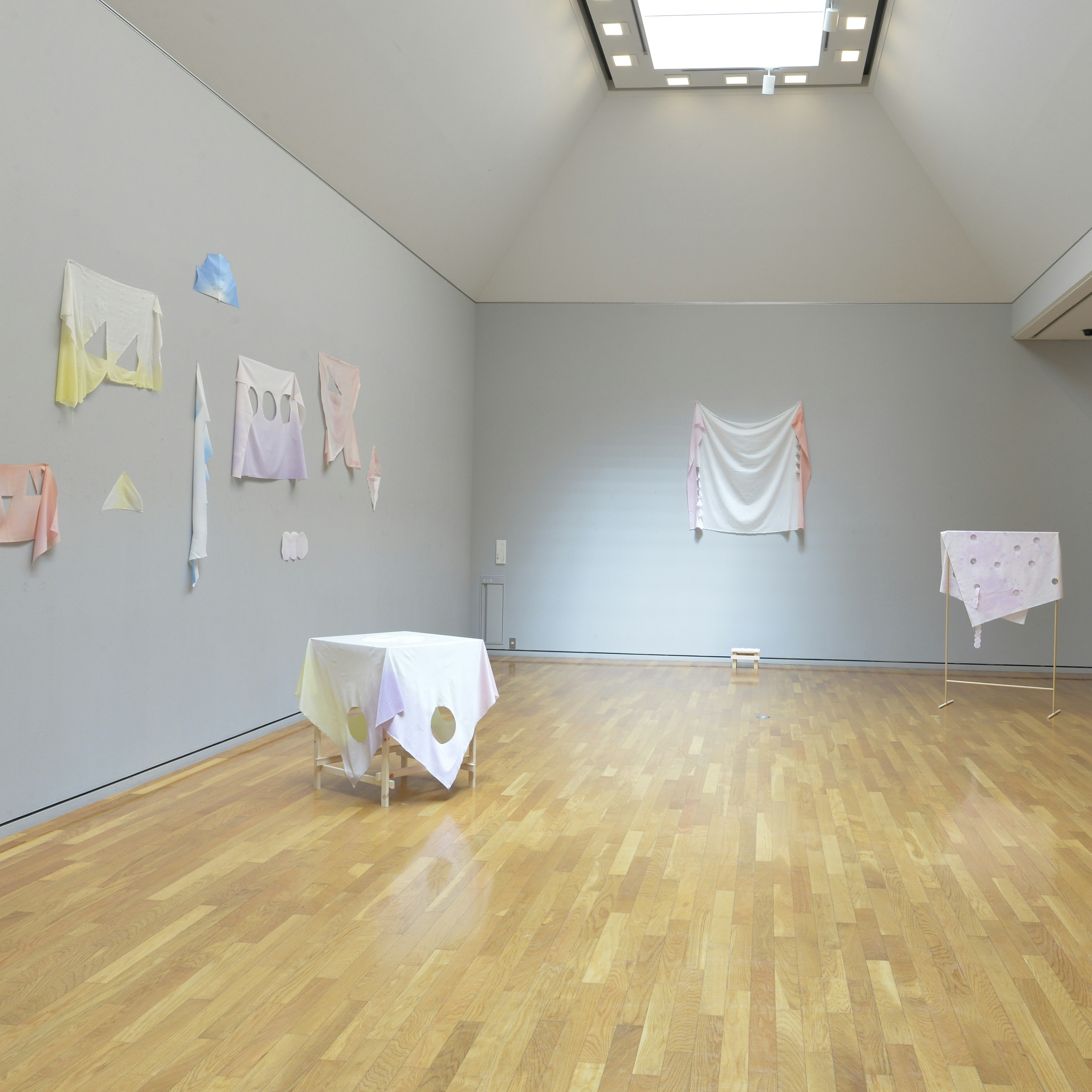 鑑賞者を最初に出迎える「展示室1」。色水で淡く染められた布地の作品「Patch work」シリーズ(2017~)が壁面に吊るされている。布の一部は丸、三角、四角などのかたちに切り抜かれており、切り抜かれた布地もまた壁面を飾る構成要素となってリズムをつくりだしている。色水による染めはサテン生地のように虹色にうつろう光沢を宿し、見る角度によって色調を微かに変える。さらに、薄手の布は展示室のわずかな空気の流れに反応し、音もなくそよぐ。その有機的な律動はいつまで見ていても飽きず、ゆっくりと息を吐き出す生き物の呼吸を思わせる。