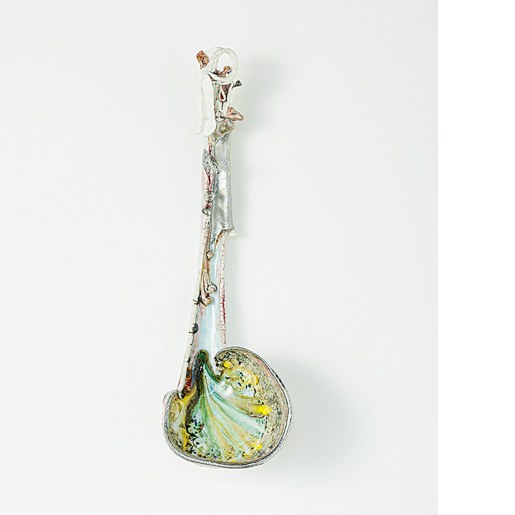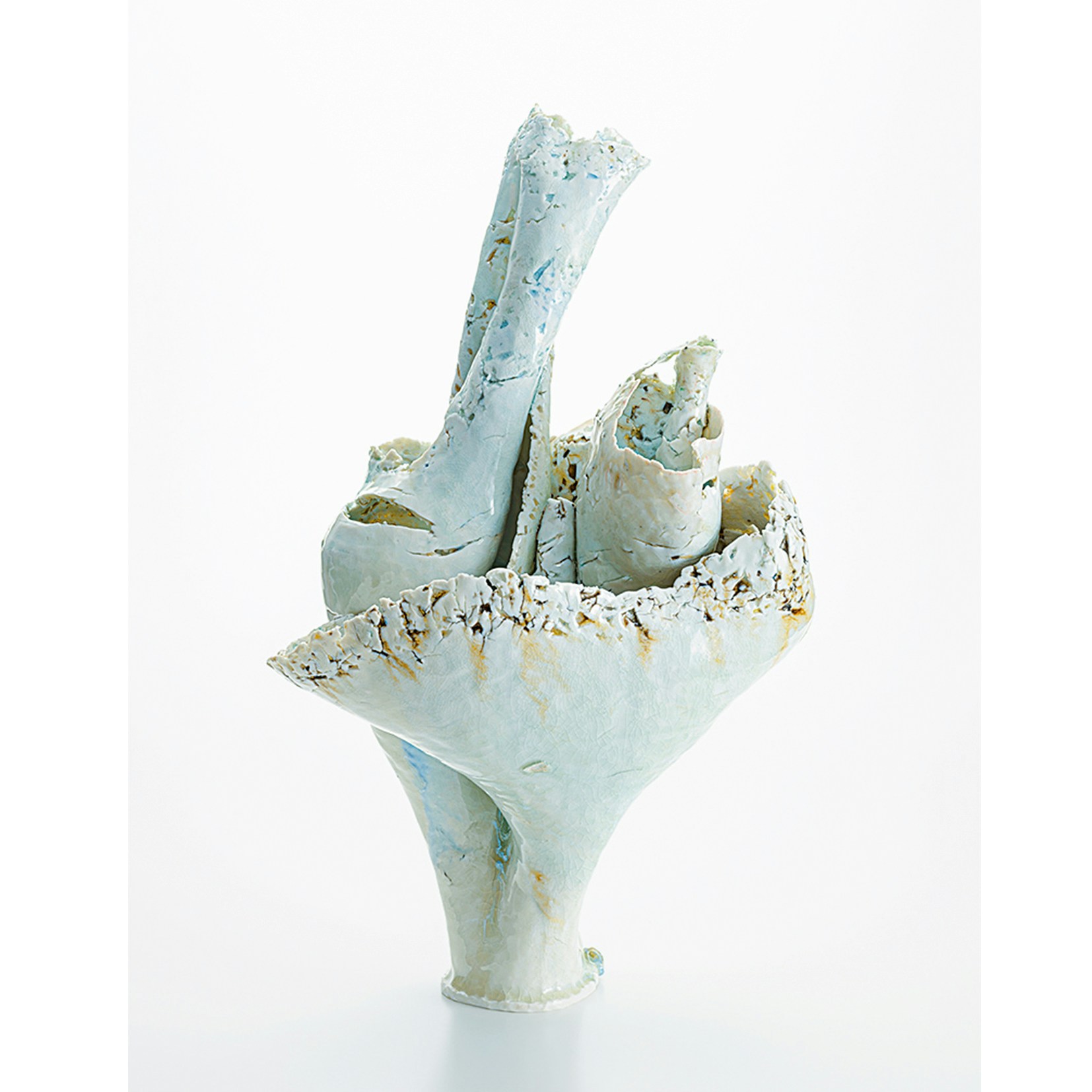 大きく分けて川端作品には、ガラス粒を練り込んだ磁土による白い作品と、銀彩を硫化して発色させる青緑の作品がある。前者は、紐づくりによって連続的に立ち上がる曲面で構成され、後者は、小さな断片が凝集してある形態をとる。今展では、これら定番作品(「Batista 」や「Soos 」「C-Cup 」)と並んで、新作群において、生と死の二重表現が、より深い、新しい展開を見せていた。それはシンメトリーではなく、肉体(トルソや襞)のなかの骨──肉体の芯として生命を支え続けるとともに、死んでなお遺り続ける骨──としてである。「Soos」のひとつに、足首、膝関節や肩関節を構成する複雑な骨の造形が現れ、「女(スプーン)」ですら、この凡庸な題名を超えて、むき出しの骨を思わせるマットな白と筋張った細部の造形のおかげで、動物の骨でできた民族楽器のように見える(「女」ではなく、死者と交流するための)。しかしなんといっても出色は、巻き貝のように複雑に入り組んだ曲面(底部から巻き上げられた壺・瓶が途中から多数に分裂したもの)が、焼成過程で崩れ落ちた、その偶然の造形をさらに取り入れて再焼成した「Calyx」のシリーズであった。骨粗鬆症のダンサーが激しく踊って崩れ落ちたような踏み潰された貝殻のような作品群は、磁土の紐に練り込まれたガラス粒の密度によって、堅牢な磁器の各部分に様々なレベルの脆弱さが生じ、その脆弱さが造形の原理となって生まれる。砕けた骨として再焼成された作品には、生命の脆さと危うさが結晶化している。