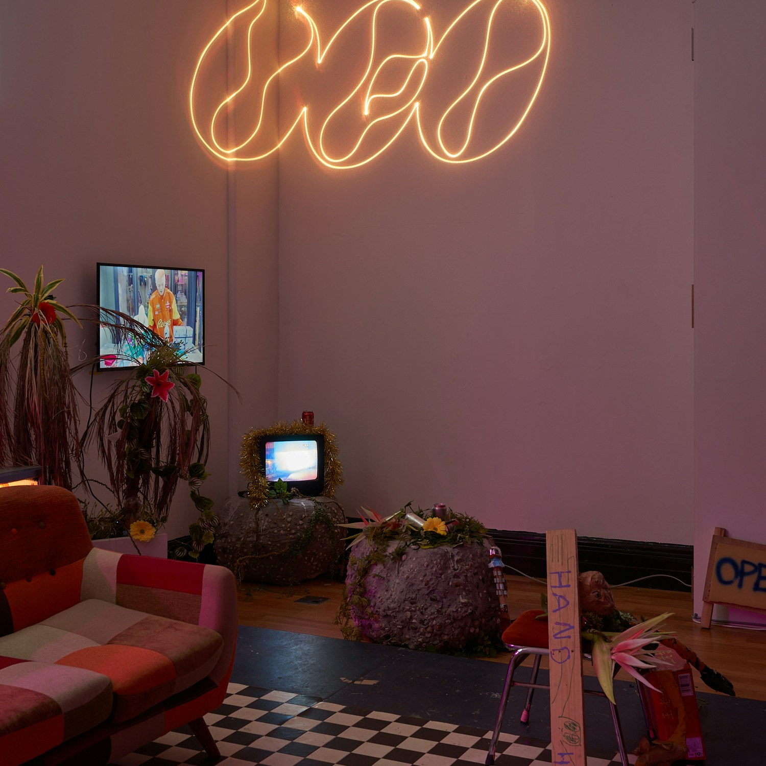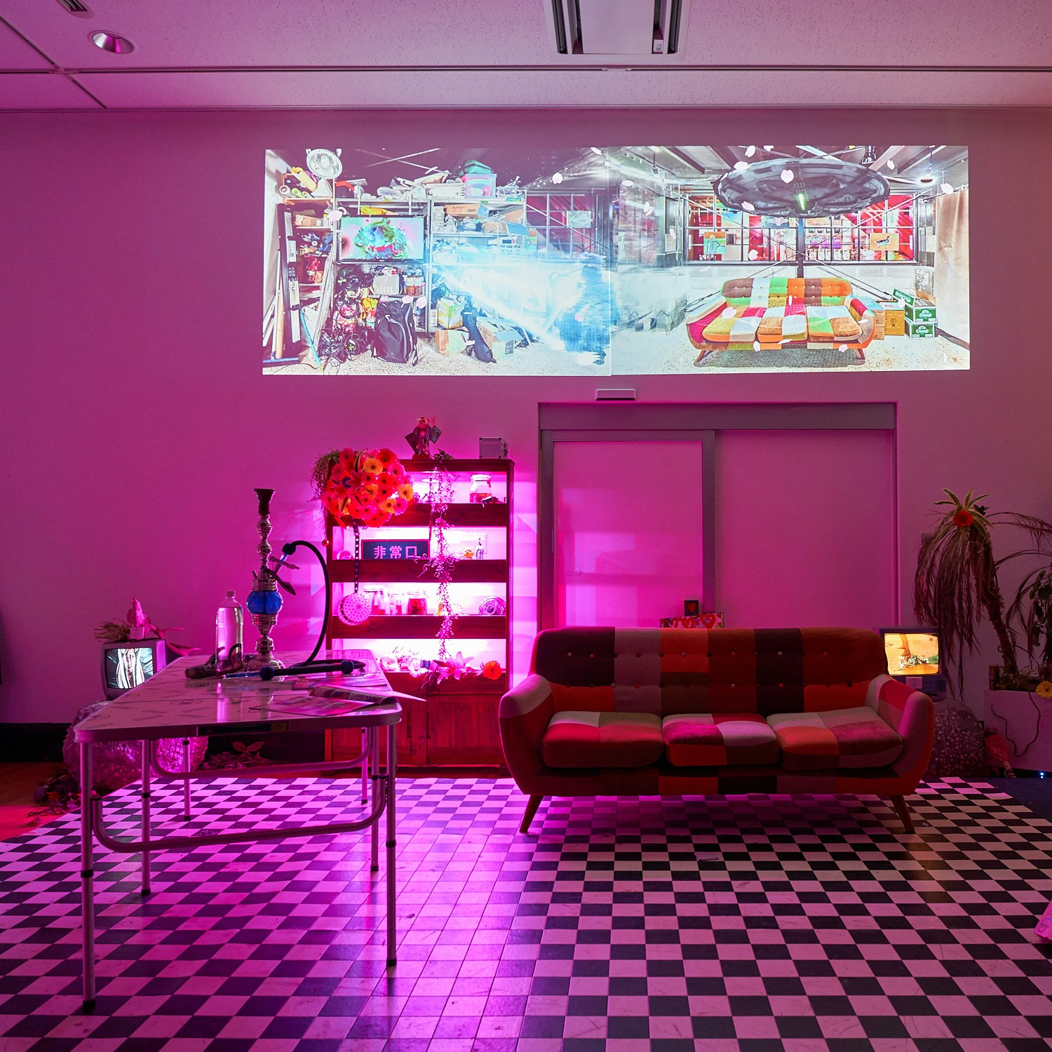 「居場所はどこにある?」展でのUGOの展示は、会場1階で行われた。暗幕で区切られた展示空間の奥から、マゼンタ色の光が漏れている。幕の内側に入ると、映像とともに様々なものが寄せ集められた空間が広がっていた。ブルーとピンクが重なりあうシンボルは、「バイ・プライド」を体現するともいわれる。他方でマゼンタは、イエロー、シアンとともに、印刷で用いる三原色のひとつだ。クイアであることを物事の主軸とすること。そのようなUGOという場の実践と模索が、内から外へとしみ出すようなマゼンタの光に重ねられていた。