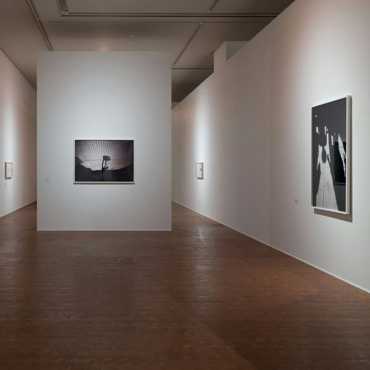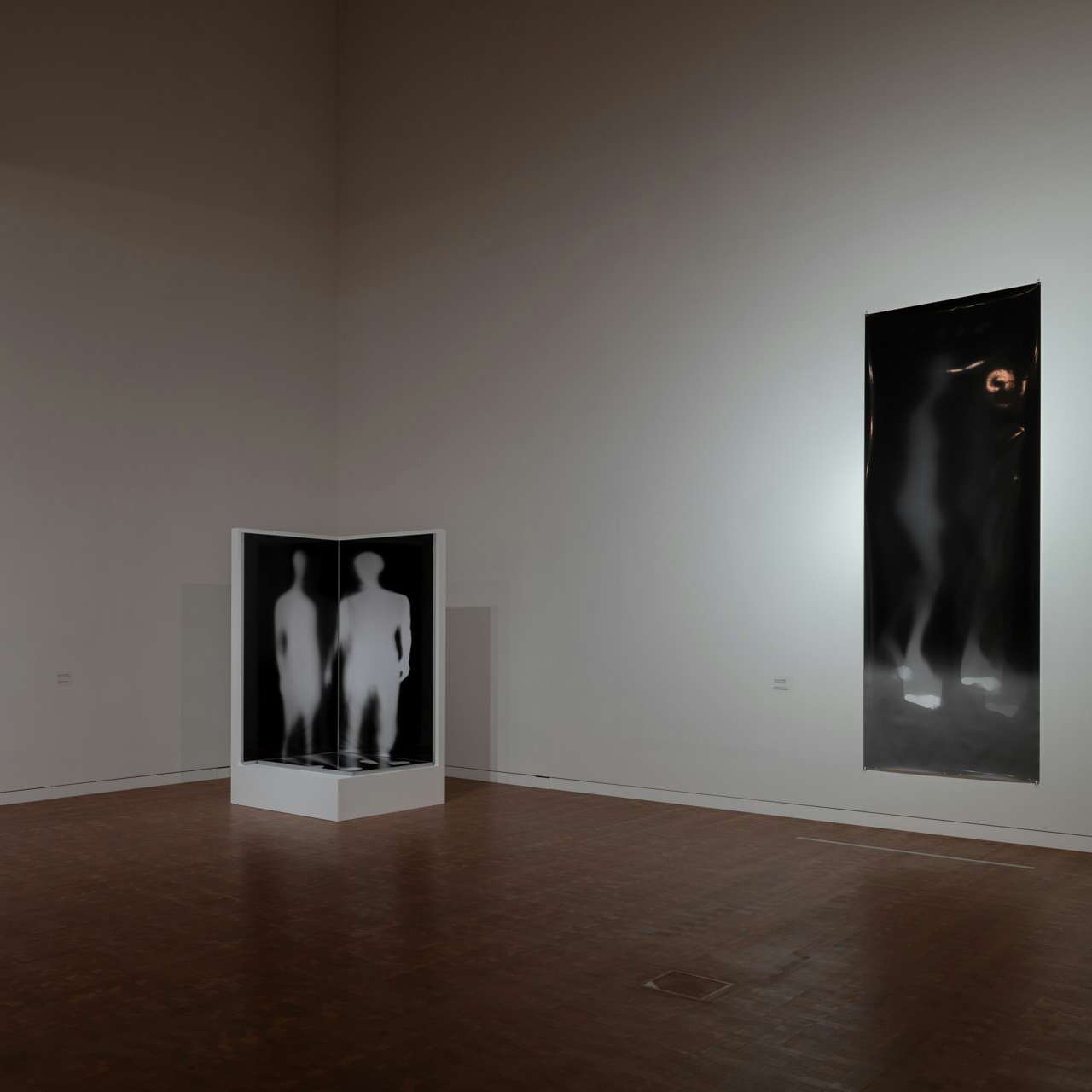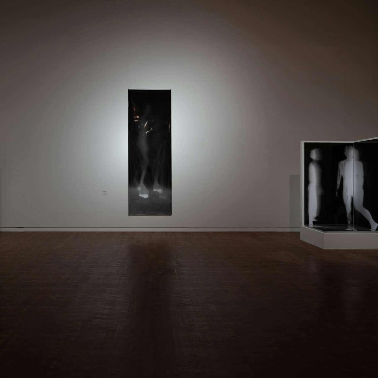 フォトグラムで焼きつけた人影を立体的に再構成した「Red Room Project」シリーズは、その最たるものである。被写体が立っていた足裏の部分が黒い印画紙に対し最も白く残り、そこからぼんやりと影が床に伸び壁に向かってクッと90度折れ曲がる。当然、こうした表現は、国立国際美術館の代表作品でもある高松次郎の「影」シリーズを想起させる。鷹野も高松に倣い(*2)、物体と影の関係や、三次元から二次元への変容を探究しようとしたのだろう。ただし、高松の作品は影の持ち主である身体の不在を強く印象づけるが、鷹野の作品は、体温を備え揺らぎ続ける身体の在りようを浮かび上がらせる。