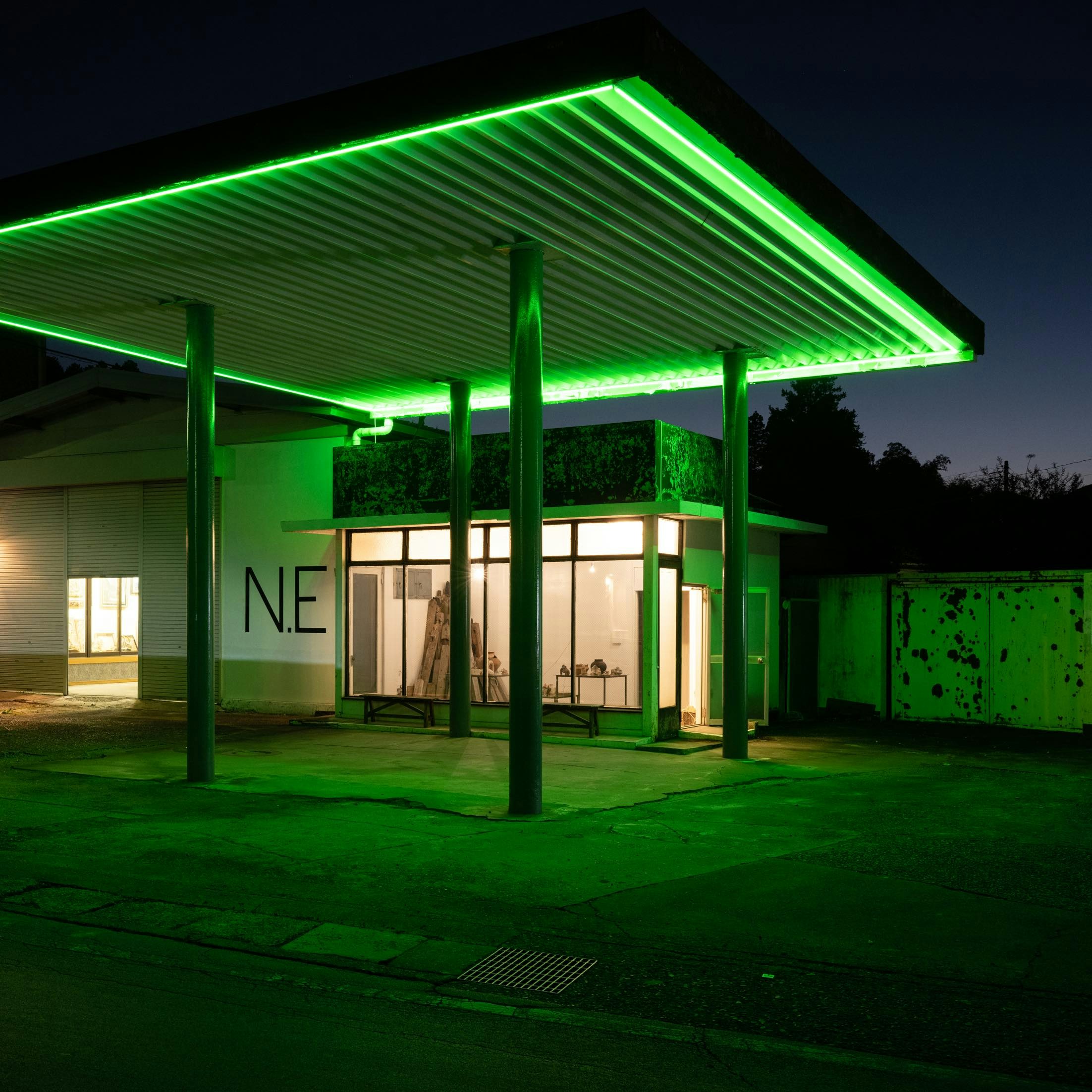 「大地で遊ぶ」のSIDE COREによる展示は、元ガソリンスタンドを会場として「夜だけオープンする陶器屋」としてつくられた。益子町に居住する作家と、SIDE COREをはじめとするその外に居住する作家が「野焼き」を通して制作の場を共同、会場にはその陶器群と映像が展示されたのである。限られた時間(17時〜22時)のみオープンした会場は、観光客が帰り、静まり返った町の片隅で煌々と光を放つことで夜半の集いの場としての意味を持ち、その場に訪れる鑑賞者は「野焼き」に集った数々の作家たちの姿と重なるようにして自分を見つめ直したのではないか。隣接する建物ではガソリンスタンドを開設したオーナー平野良堅による絵画や木彫作品がSIDE COREのディレクションによって展示され、筆者が訪れた際、既に亡くなっている平野良堅その人を知るご夫妻が藤原にその思い出を語っている姿を見たことが忘れられない。きわめて個人的な思い出の語りは、展覧会の批評とは異なる位相にあるが、しかし、確かにそれはこの場が展覧会場として設定され、SIDE COREによる展示がいわゆる作家だけに留まらず展開されたことで生まれたものだった。この土地に生きる人にとって「日常」であったはずのその場所で、「未知」が顔を覗かせた瞬間である。