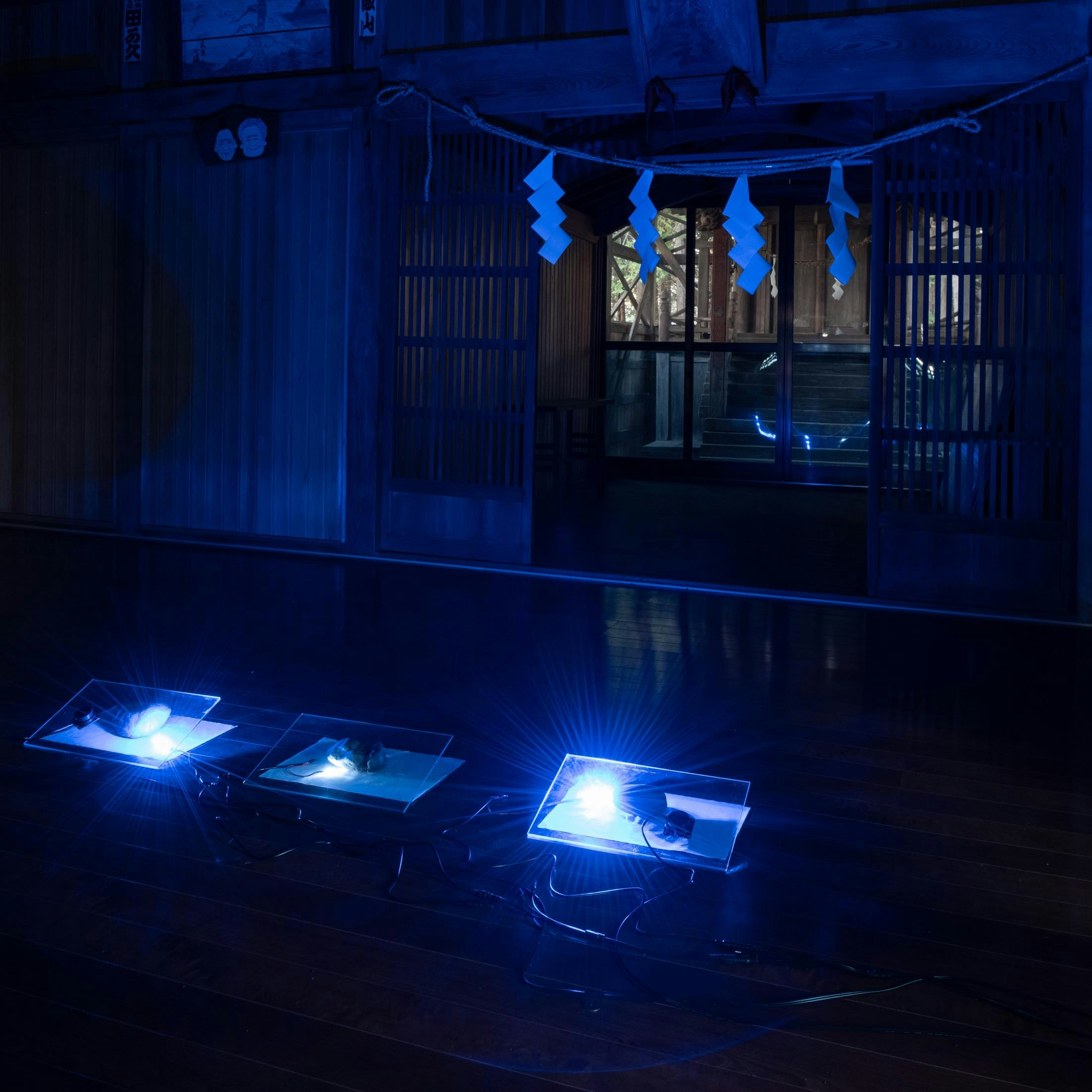 「七つの神社を巡る」は、益子町の全域にわたって位置している7つの神社・境内を舞台に7名の作家が展示するものだったが(*3)、八幡神社(長堤)で展示されていた仲田智のドア状の形態の作品を、近所に住み参拝に来たと思われる年配男性と子どもふたりの連れあいが不思議そうに見つめていた姿も同様に印象深い。観光客にとって、神社・作品はともに「未知」であるという点で等しいと言えるが、ここに暮らす居住者にとってはそうではないということがこのような瞬間に思いがけず立ち会うとよくわかる。これは神社という土地・住民と密接に結びついた場所を会場にしているからこそ起こることであって、美術館やギャラリーではこういうわけにはいかない。また、7つの神社には川崎義博による作品《七つを結ぶ音》が展示された。これは、「七つの神社を音で結ぶ」と題して広域の神社を「音」でつなげることで「「空間/結界」を創り出す」(*4)試みで、その各神社の音源は、人の声や水の音、空気の振動音などモチーフの違いがあるという。音は空気の振動によって生じるものであるから、天気や温湿度など、作品の設置されている環境の日々の違いからも影響を受けるだろう。個別でありながら全体として一つの作品として発表され、しかし鑑賞の順序は問わず、環境の違いによってもその音が変わる可能性を持つ作品からは、作品という存在もまた、確固としたものではなく未知なる可能性を内包していることがうかがえた。