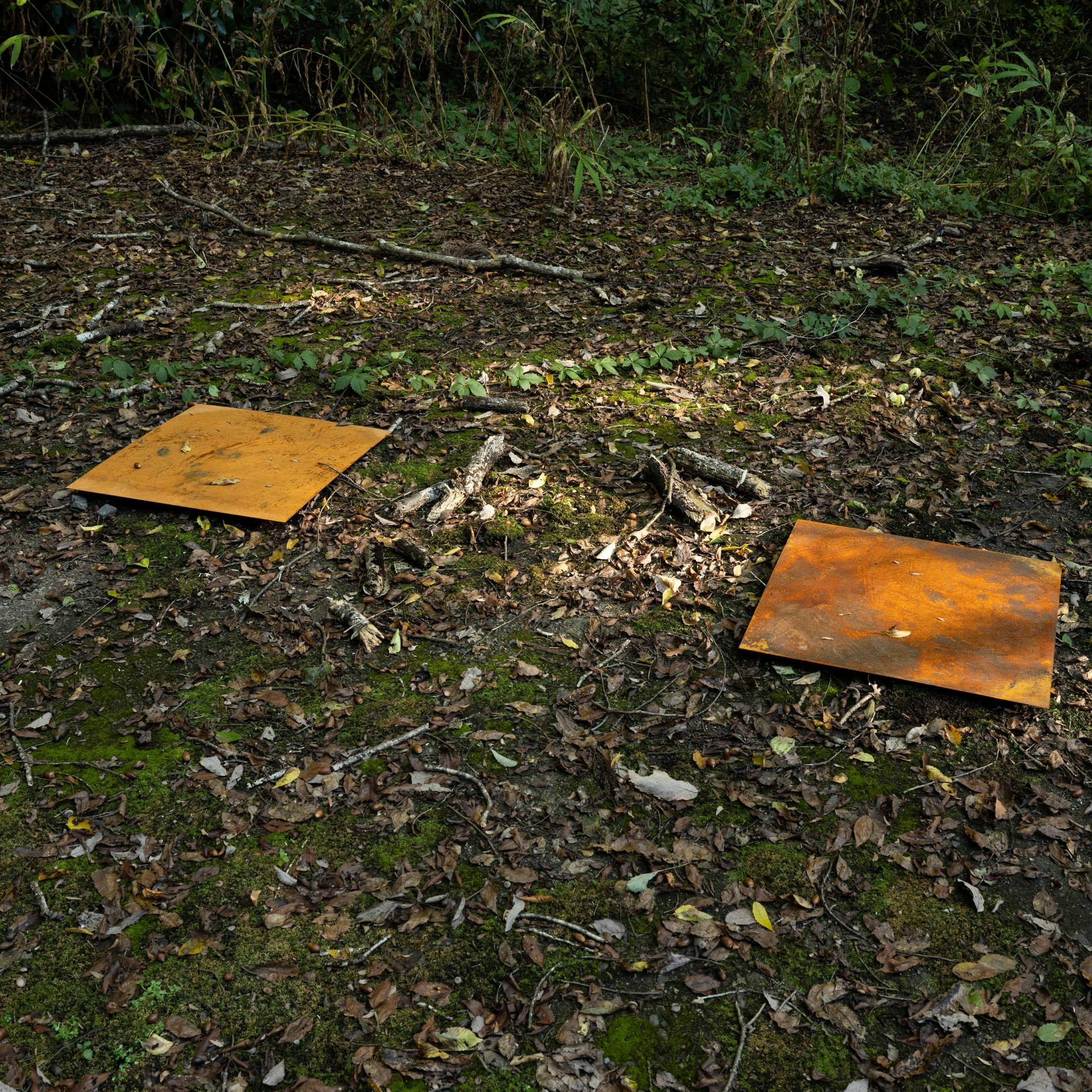この点は、「森を歩く」で小田桐奨と中嶋哲矢によるユニットL PACK.が、「彫刻を問う集団」AGAIN- STへの依頼を通して作り上げた「陶芸家とすえの森」でいっそう明瞭に浮かび上がっている。益子向原の杉林を「とある陶芸家の土地」(*5)と見立て、かの陶芸家が「制作の参考にするために集めた、たくさんの陶片や取るに足らない小さなものを、切り株の末口に並べ」ていたという物語を設定し、その杉林の切り株にAGAIN- STメンバー(冨井大裕、深井聡一郎、藤原彩人、保井智貴)が各100点もの陶片を制作、設置したのである。さらに、それらはL PACK.によって「一人一点持ち帰ることができる」という「噂」が流され、会期中、減ったり、そうして持ち帰られたところに別の陶片があらたに置かれたりする(筆者も一点持ち帰っている)。展示のクローズ中はロープで結界をめぐらせているものの、完全な密閉空間にはできない(作品保全ができない)屋外という環境を逆手に取ったのである。