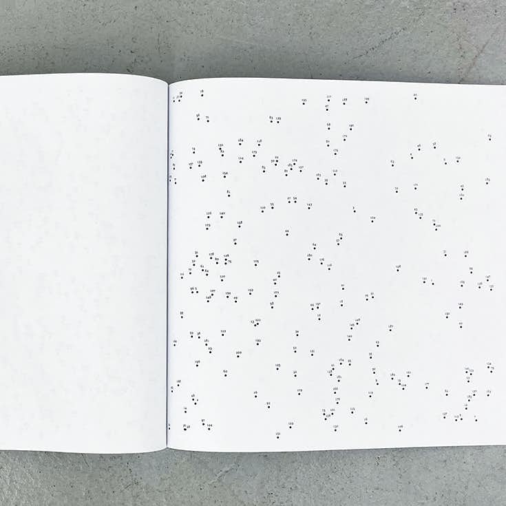 だからだろうか。エキソニモが刊行したこの書籍は、そのタイトルにある通り、ページをめくるごとに増えていくドット(点)に沿って進んでいく。このドットの位置はコンピュータでランダムに決定されており、どの位置にドットを打つかといった作者の意図──通常は美術においてもっとも重要だとされている──は最初から周到に排除されている。ただし、このように順を追って増えていくドットをページに印刷することを、エキソニモが「子供が順番に線を繋いでいくことで絵を描くことができる『点つなぎ』から着想」したとしている通り、ドットを線でつなぐことで、誰もが同じ「絵」を描くことができる。違うのは、子供のための本が、線をつなぐことでなんらかの意味を持つ図像を浮かび上がらせるのに対して、エキソニモの本では順番に点と点を線でつないでも、見えてくるのは抽象的な図形でしかないということだ。これは点の位置と順番が決まっているかぎり、線の太さや色、画材などで偶然程度に多少の違いは出ても、誰が行っても基本的に(必然的に)大きな代わり映えはしない。その意味でもこの「ドローイング」は、個性の表出による独自性を持つことで個的な価値を備えるとしてきた美術作品の概念から大きく離反している。