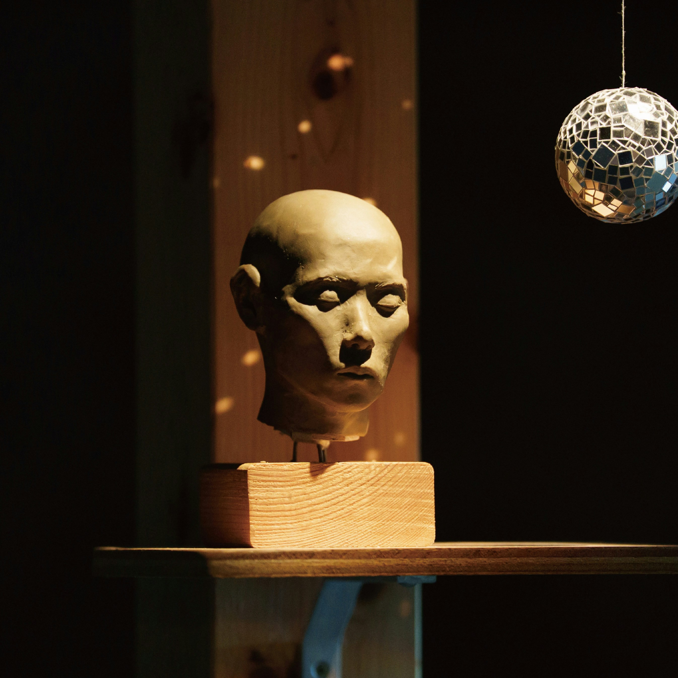 銭湯だった頃の面影が色濃く残る会場のなかに、上記の映像、作家自身をかたどった塑像、ミラーボール、弟の死についてのエッセイなどからなるインスタレーションが広がる(*1)。時間になると、この場所を用いたパフォーマンスが展開されるが、それ以外の時間は室内を自由に見て回ることができる。