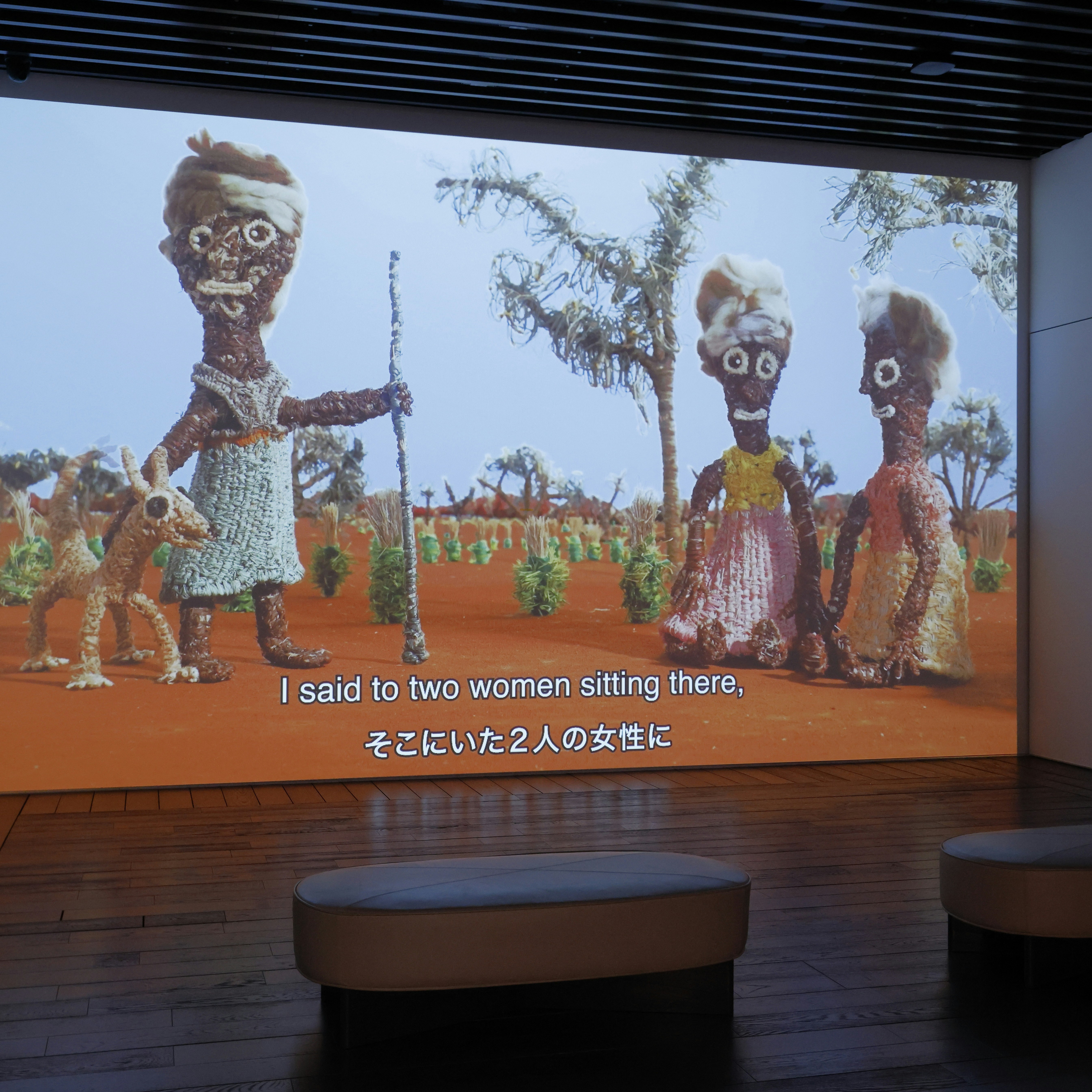 そのなかで、筆者がとくに注目したのが本展で唯一のコレクティヴ(美術的な用語でもある「コレクティブ」と呼ぶことにも多少の疑問があるが)であるジャンピ・デザート・ウィーヴァーズである。中央砂漠から西砂漠地域の400人以上の女性が参加する彼女たちの活動は、もともと1995年に文化的な方法によって生活の収入源を確保するために始まったという。現在では砂漠の草を編んだ立体作品やインスタレーションを制作しており、本展では、草で編まれた人形や動物を用いたコマ撮りアニメーションが出展されている。参加者による日常的な生活や過去についての記憶と、コマ撮りによるユニークな動きによって人形たちが出来事を演じ出すアニメーションは、たんなる作品のプレゼンテーションという以上に、地域の文化継承の機能を持っている。つまり、彼女たちの創作活動は、父権的な美術制度に依らない共同体的実践のオルタナティブを提示しており、本展の焦点を効果的に提示しているものに見えた。