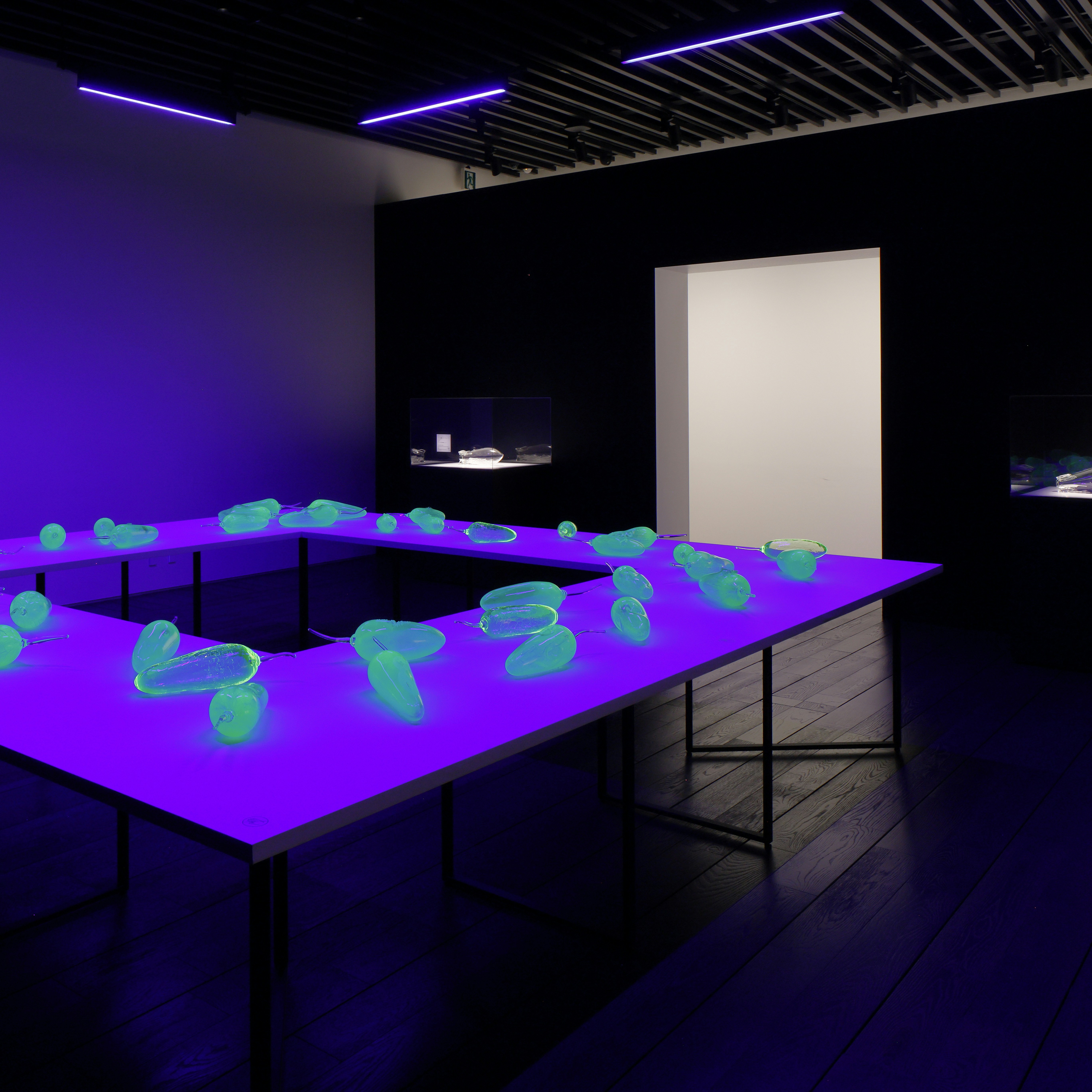 また、ギャラリー奥に展示される柳晋哉と金井志人の《泥中の布》は、本展のハイライトでもある。テーチギだけでなく、月桃や椎木、ヒカゲヘゴ、福木といった奄美の植生を染料として用い、金井が染めた糸を柳が織り上げた。伝統的な技法を拡張しながらも、その枠を超えた協働のプロセスによって新たな関係性を紡ぎ出す。伝統の「拡張」以上に、異なる素材実験を横断し、協働プロセスそのものを作品化する点に力がある。