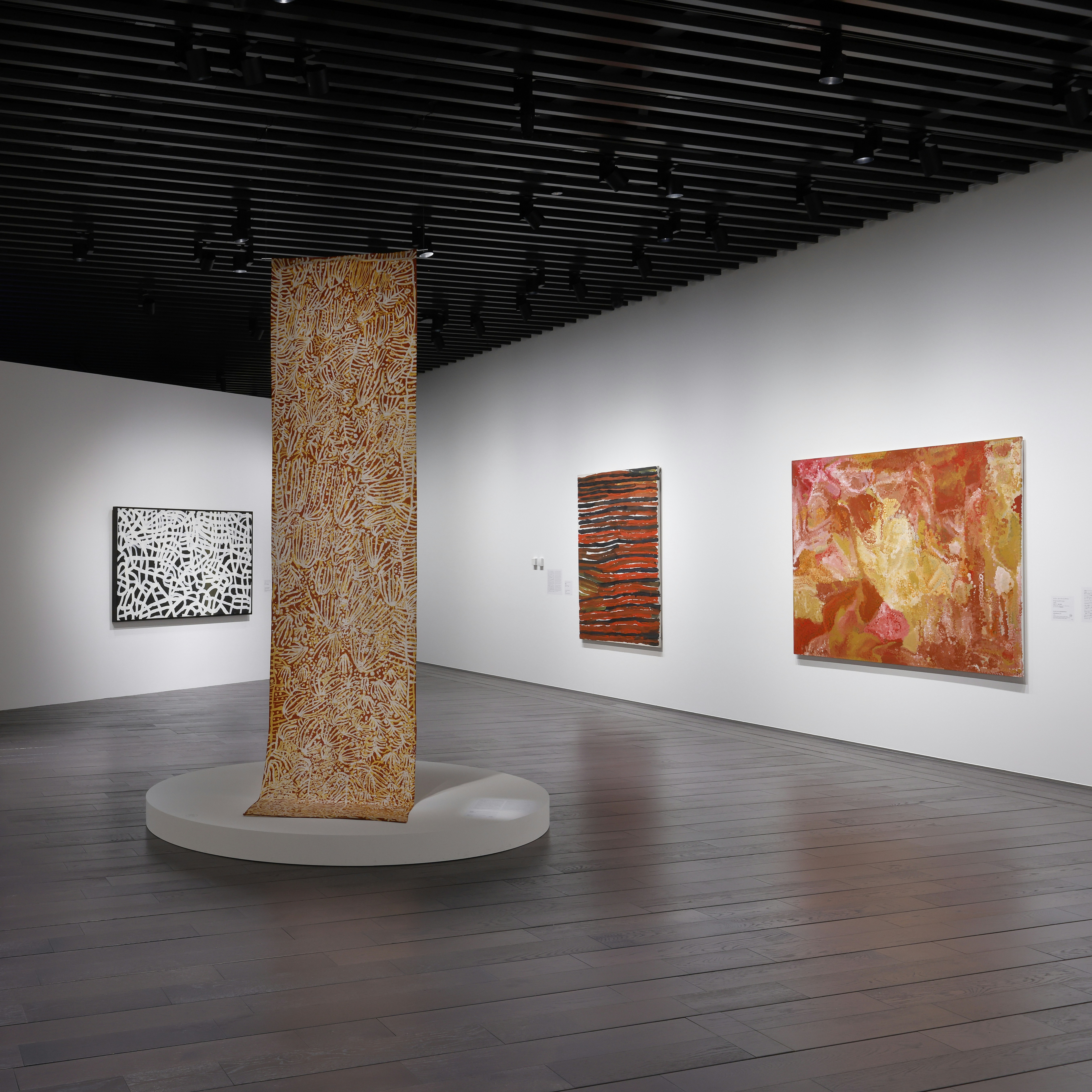 本展で、鍵となるのはアボリジナル女性作家たちが置かれてきた「二重の周縁化」である。1970年代から80年代初頭、現代アボリジナル・アートが興隆した時期に中心にいたのは男性作家であった。女性による制作は、バティックやバスケット、装飾品といったものに限られ、「工芸」や「実用品」として扱われた結果、西洋的な美術史の枠組みからは排除され、彼女たちは先住民かつ女性であるという二重の周縁化のなかで、正統な評価を受けることがなかった。しかし1980年代後半以降、女性作家たちはこの立場に挑み続け、今日ではオーストラリア現代美術の中核をなす存在となっており、本展はそうした観点に光を当てる(*2)。
