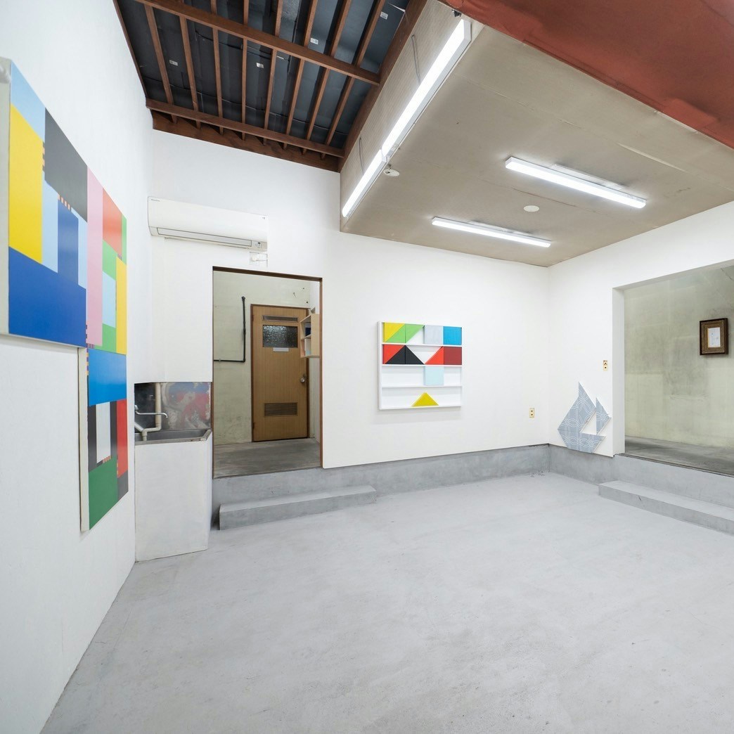 壁の下方すれすれに展示された7つの三角形のキャンバスからなる《タングラム・ペインティング》と、色とりどりの三角・四角のブロックが枠に収められた《再配置できる絵画 #7》。末永は、未完成の状態を前提とする作品から完成とは何かを問う。「動く」絵画への探求から制作された両作は、自由に組み替え可能な「あそび」を持ちつつ、その最中に訪れる完成(らしき姿)でそのかたちを一時的に留める。