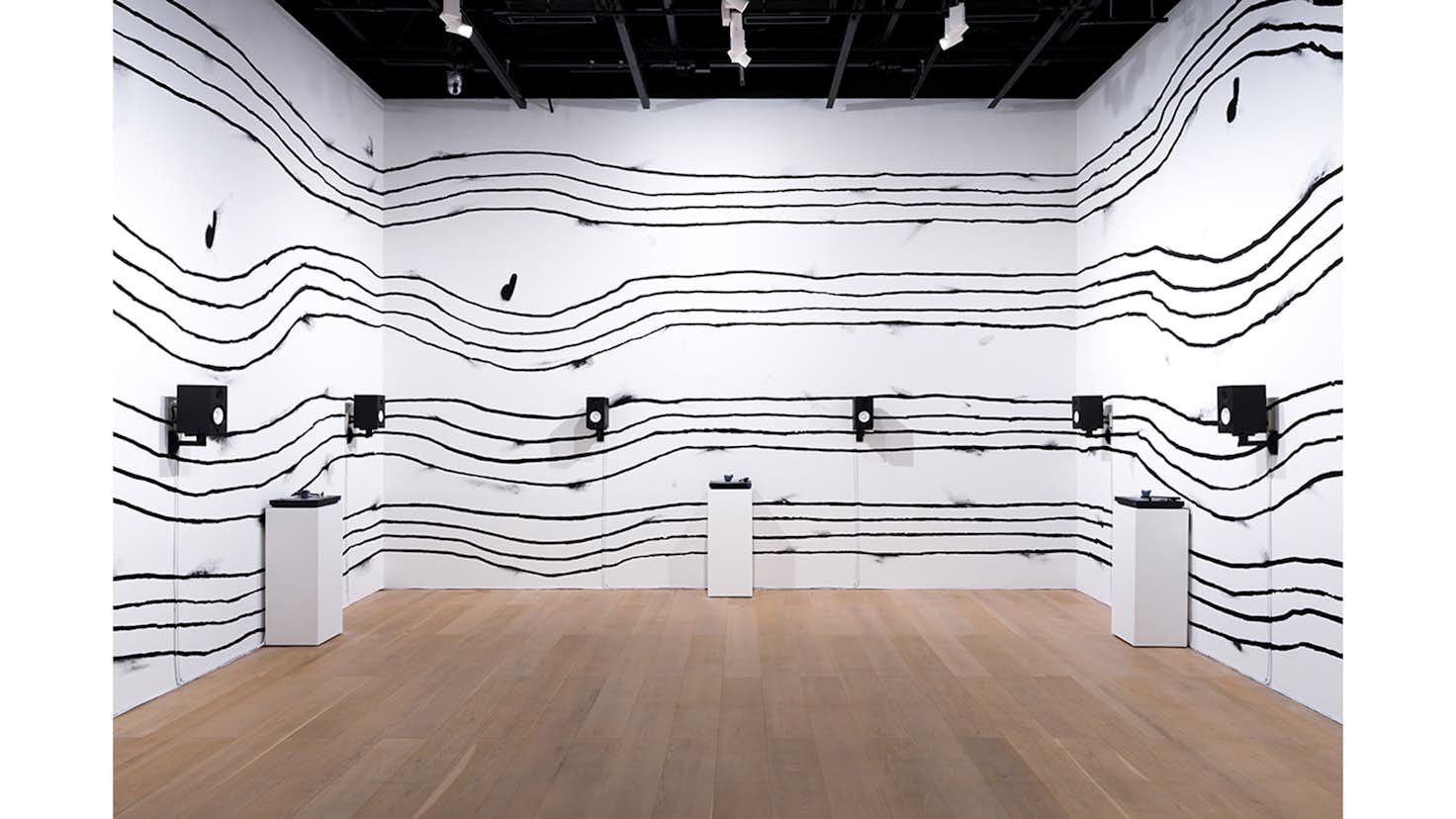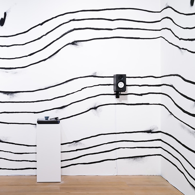 今回の展示では、壁いっぱいに描かれた壁画《音の波紋が広がるところ》と、サウンド・インスタレーション《コミュニティのため息》が展示されている。展示室に入ると、四方いっぱいに描かれた黒い4本の線をベースにしたドローイングに囲まれる。それらの線から逸れるようなかたちで音符のような記号も描かれており、五線ではないが、何か楽譜のような印象を受ける。西洋の伝統的な音楽から生まれた記譜法で用いられる五線譜から一本線が少ないということに何か意味があるのではと考えさせられた筆者であったが、五線譜を手話(キムはアメリカ手話の話者である)で表現しようとした際に、親指以外の四本の指で表現した方が視覚的にイメージに近かったため、四本の線を用いている。言語を用いて何かを表現するとき、言語が変われば表現方法を柔軟に変更することも可能だということにふと気付かされる。