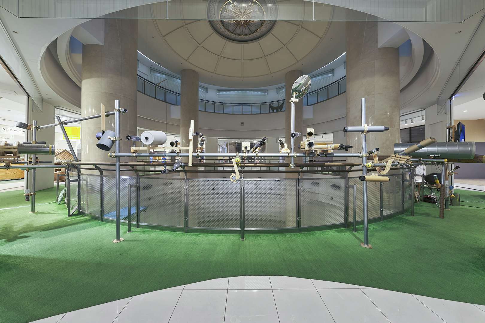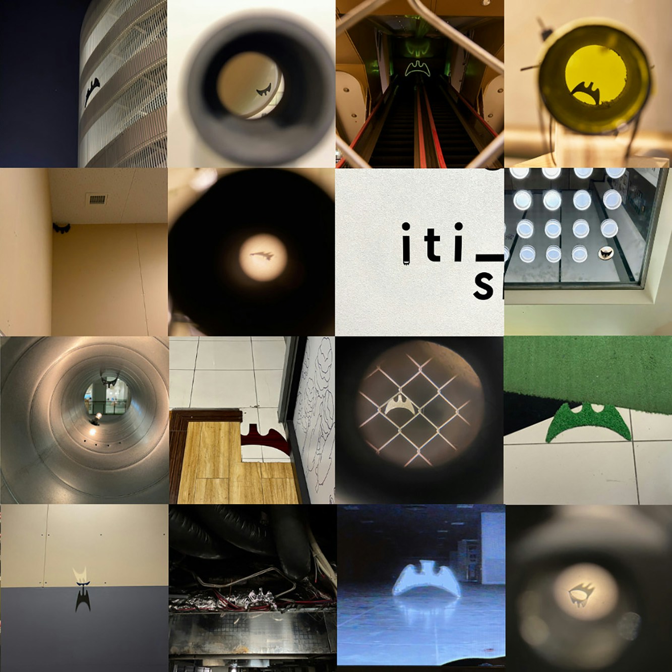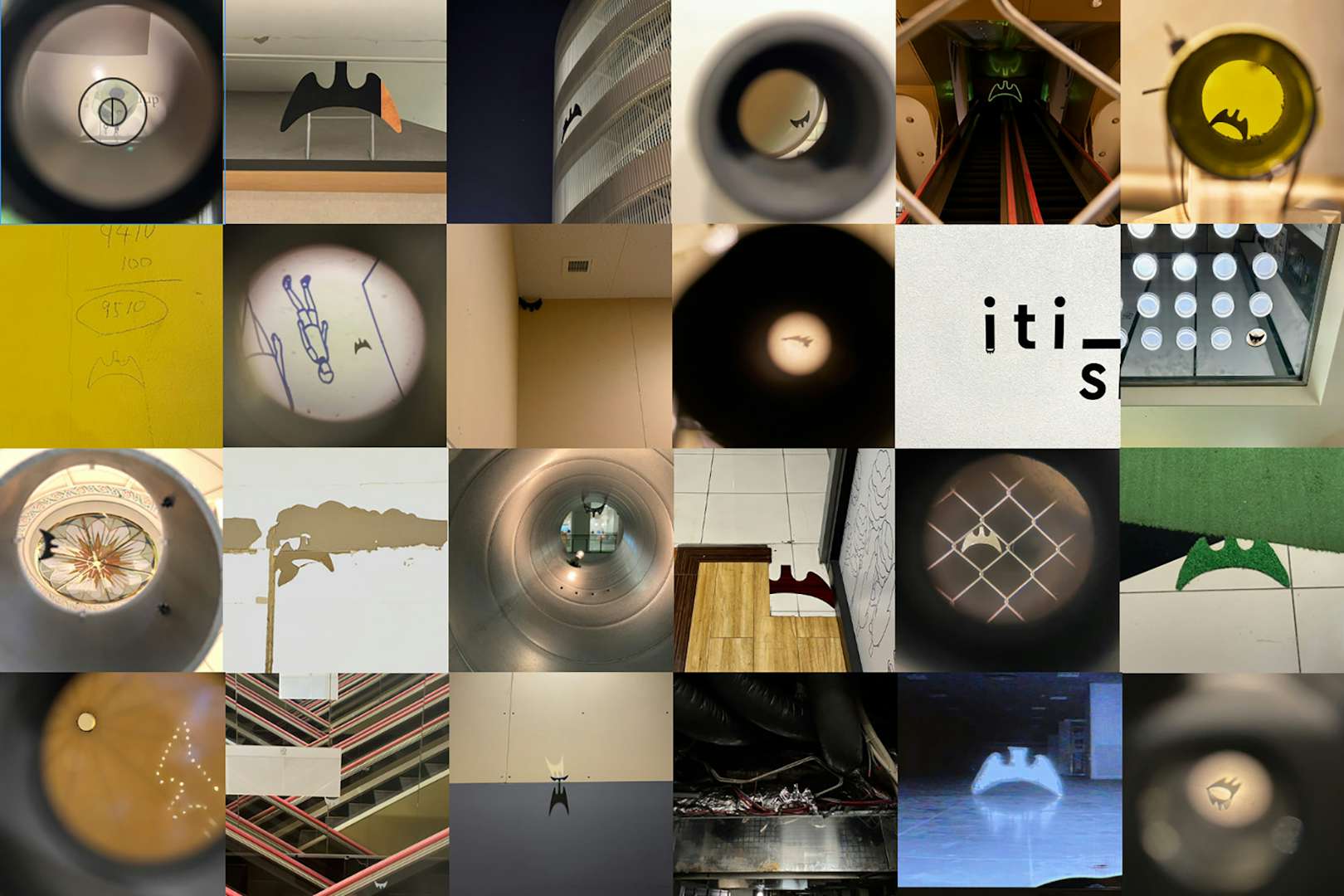 とりわけ、会場の吹き抜けに設置された《複眼鏡》は、複数の望遠鏡が並び、覗き込むと市章のコウモリマークが見えるようになっている。カメラのレンズと木材を組み合わせた手づくりの望遠鏡の視線の先には、サイズも向きも様々なコウモリマークが待ち受けている。一番大きな望遠鏡を覗いてみると大きなコウモリマークが映っているが、近すぎて焦点が合わないあまり、まるで目の前に飛んで追ってくるような印象を受ける。なかにはブラウン管モニターに映し出されるコウモリマークもあり、同じ形のマークが多数目の前を飛び交っているにもかかわらず、気づけば飽きることなく、ゲーム感覚でマークを探すことに夢中になっている。さらには、繰り返し何度もこの市章を目にすることで、会場の外に出ても、街中で無意識のうちにこのマークを見つけてしまうにちがいない。iti SETOUCHIの外観やマンホールなど、日常に潜むこのマークを探すことで、新たな目で自らの生活する場所を見直すことができるだろう。