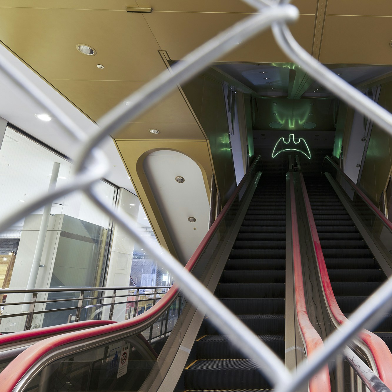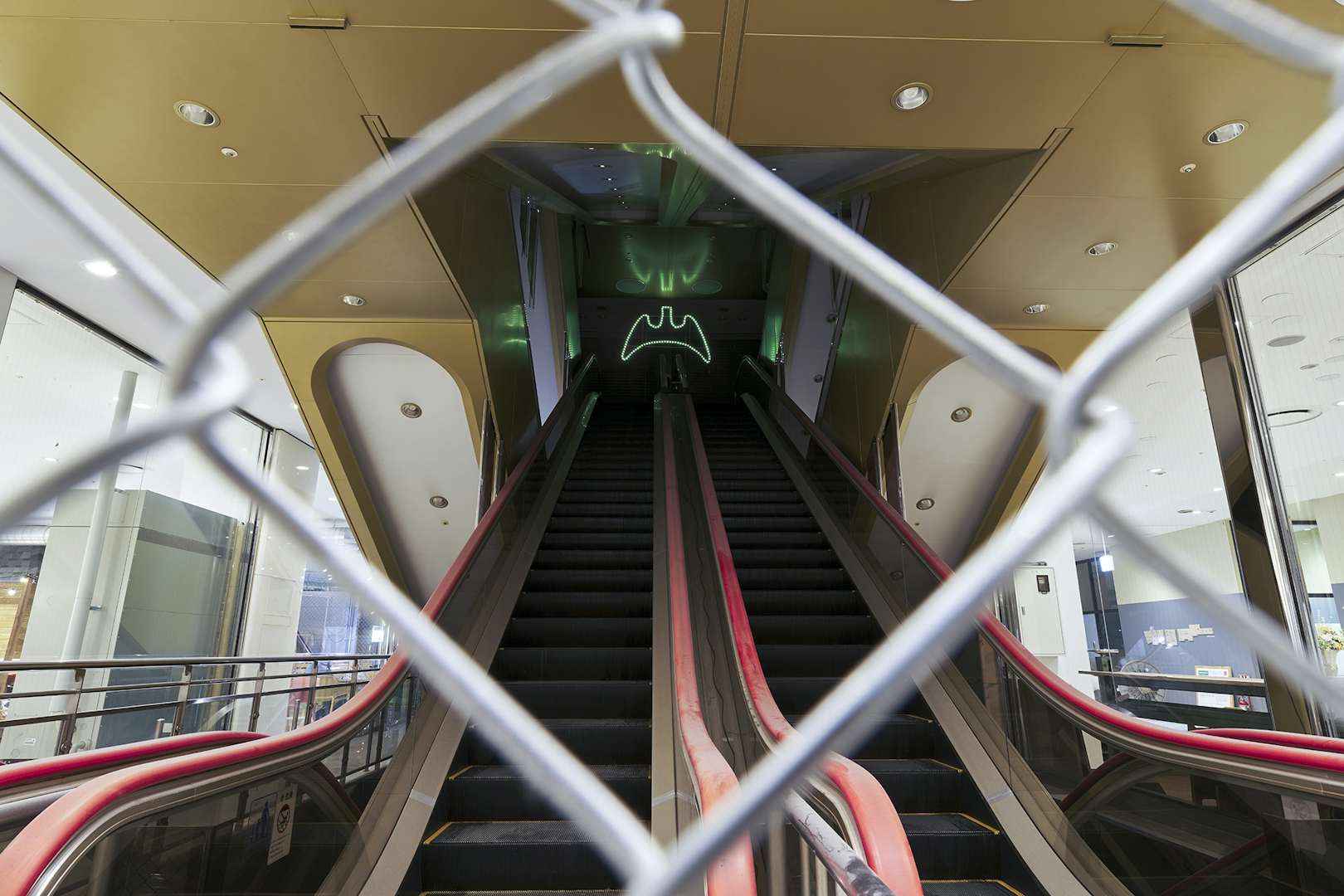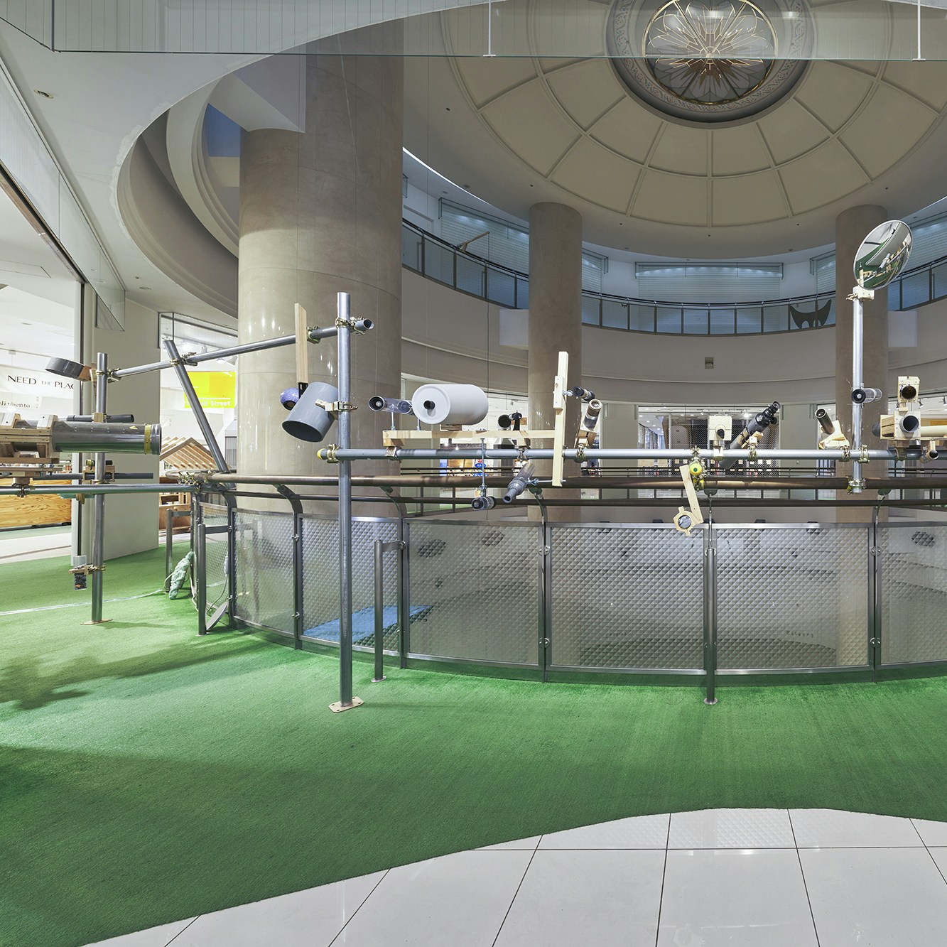 とりわけ、会場の吹き抜けに設置された《複眼鏡》は、複数の望遠鏡が並び、覗き込むと市章のコウモリマークが見えるようになっている。カメラのレンズと木材を組み合わせた手づくりの望遠鏡の視線の先には、サイズも向きも様々なコウモリマークが待ち受けている。一番大きな望遠鏡を覗いてみると大きなコウモリマークが映っているが、近すぎて焦点が合わないあまり、まるで目の前に飛んで追ってくるような印象を受ける。なかにはブラウン管モニターに映し出されるコウモリマークもあり、同じ形のマークが多数目の前を飛び交っているにもかかわらず、気づけば飽きることなく、ゲーム感覚でマークを探すことに夢中になっている。さらには、繰り返し何度もこの市章を目にすることで、会場の外に出ても、街中で無意識のうちにこのマークを見つけてしまうにちがいない。iti SETOUCHIの外観やマンホールなど、日常に潜むこのマークを探すことで、新たな目で自らの生活する場所を見直すことができるだろう。