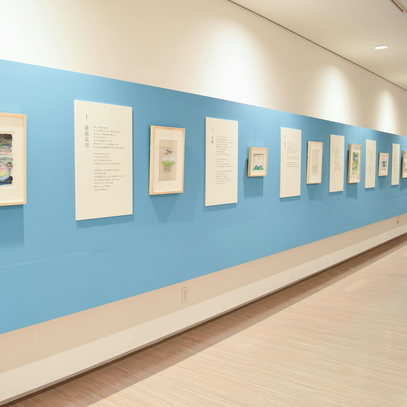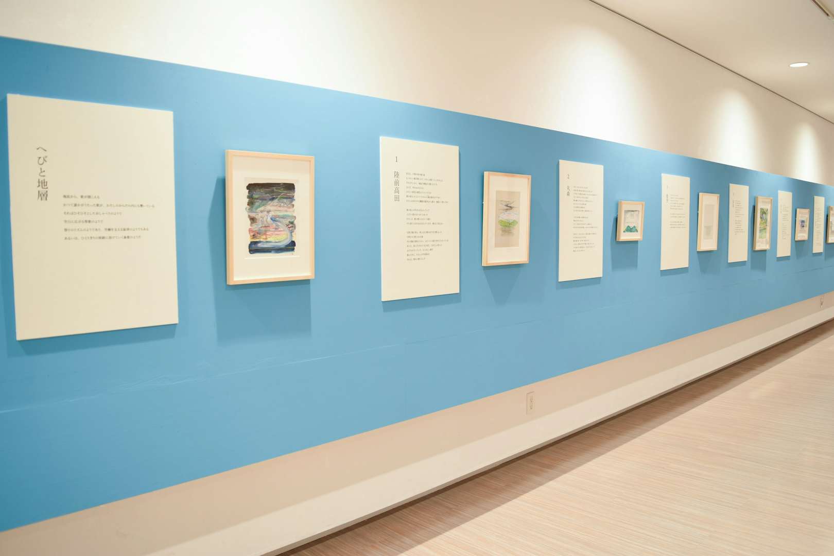 この主題は、とくに展示室の奥の一面、展示パネルの上に(詩的な)テクストと絵が交互に並べられている箇所においてかたちにされている。テクストは左から順に、「へびと地層」、「1 陸前高田」、「2 丸森」、「3 能登」、「4 似鳥」、「5 東京湾」、「6 マーシャル諸島」と題されており、それぞれの右側には、それらの内容──どれもへびや海に関するものである──に対応していると思しき絵が展示されている。そして、展示パネルは少し緑がかった明るい水色をしているが、この色は「たびたび水の表象として現れるへび」(*8)の表現だろう。つまり、水としてのへび、あるいはへびとしての水(とくに海)の存在が、小森+瀬尾の訪れた6つの土地に関する物語をつないでおり、そのことによって、展示パネル上にいわば個々の物語よりも大きな「物語」がかたちづくられているのだ。