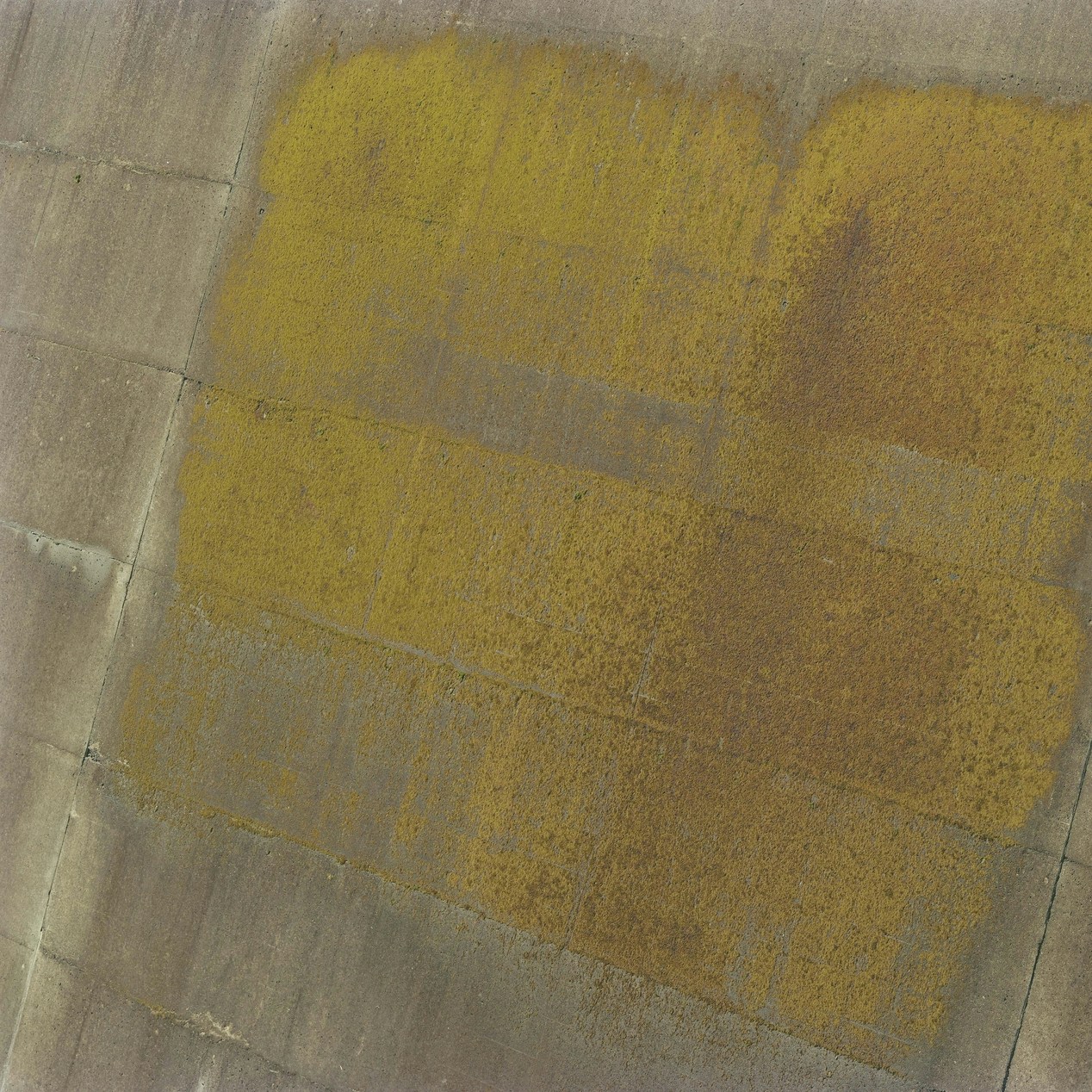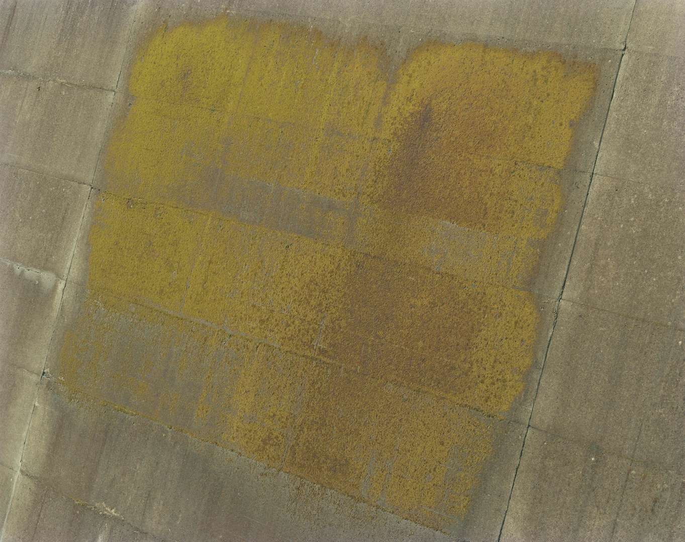 そして、3つめのタイプは、人工造形物の一部に生えている植物を写した作品である。例えば、《山口県下松市》(2024)にはコンクリートの壁面に生えている苔が写されている(*7)。その苔は、12個のコンクリートブロックの表面からなる四角形のなかに収まっている。その作品にみられるのは(たとえそのサイズが小さくなくとも)、人間を圧倒し、人工物を超越するような崇高な生命ではなく、むしろその場にこそ存在する苔の世俗的な生である。このタイプの写真は、いわばこれまで作家が写してきた人工造形物の細部の撮り直しであり、そこに存在していたとしても見過ごされてきた植物の、そのたたずまいを主題としているかのようだ。わたしにとって、柴田の「新たな展開」としてもっとも興味深いのは、ほかならぬこのタイプの作品である。