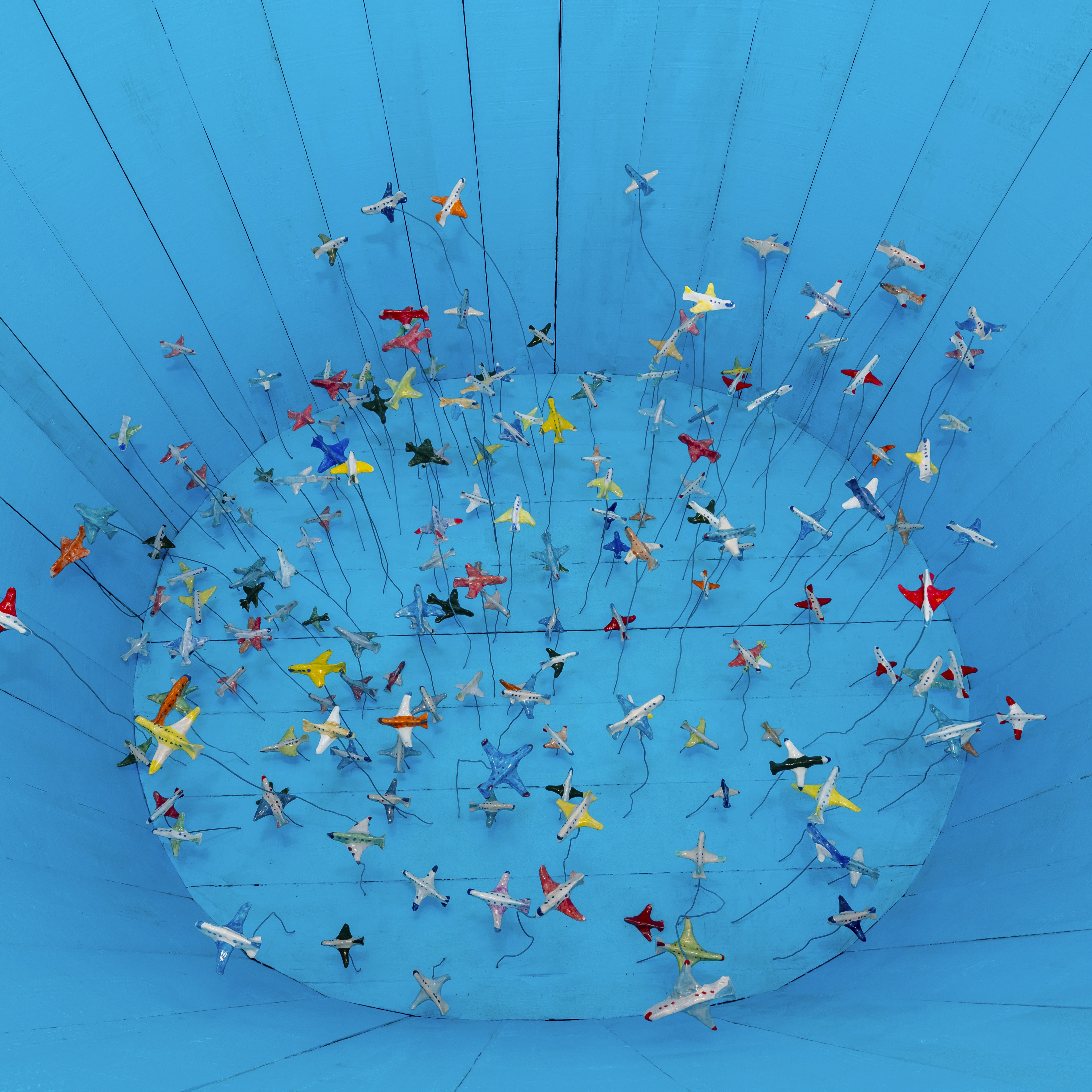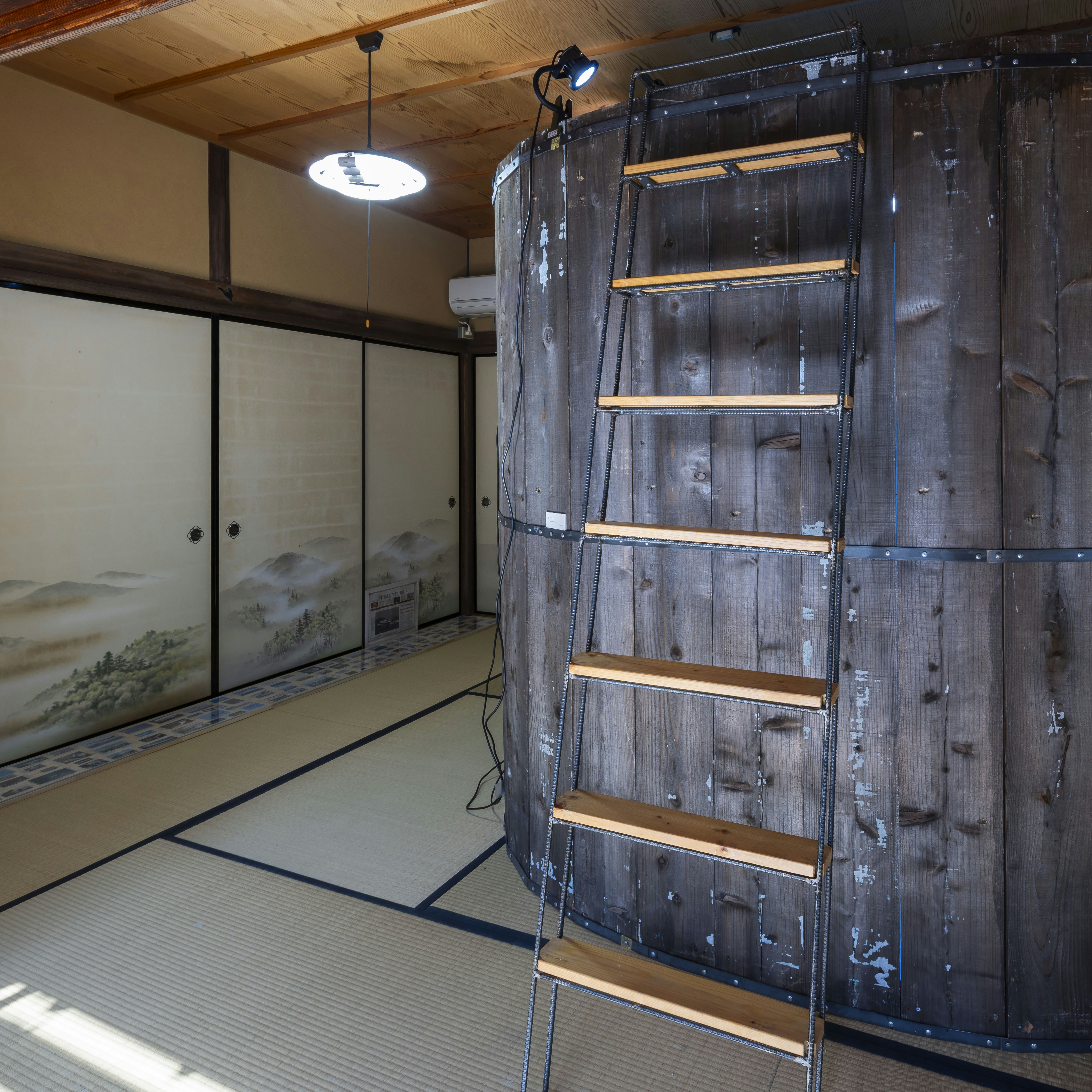 知覚の「ズレ」はアーティスト・渡辺英司が手がける風景の異化を通じて多様に展開する。生垣に自生するかのように配された小さな飛行機たちの群れに導かれ、次なる会場へと向かう。数寄屋風の瀟洒(しょうしゃ)な造りの屋内で一際目を引くのは、天井に達しそうなほどに巨大な樽だ。梯子を登り、そのなかを覗き込むと、空色に塗られた樽の内部にたくさんの飛行機が閉じ込められた光景が広がる。作家が20年前に見た夢(*3)を起点とする《空の夢》(2024)は、輸送手段である「飛行機」を貯蔵のための「樽」に閉じ込めるという、機能とスケールの倒錯が見て取れる。