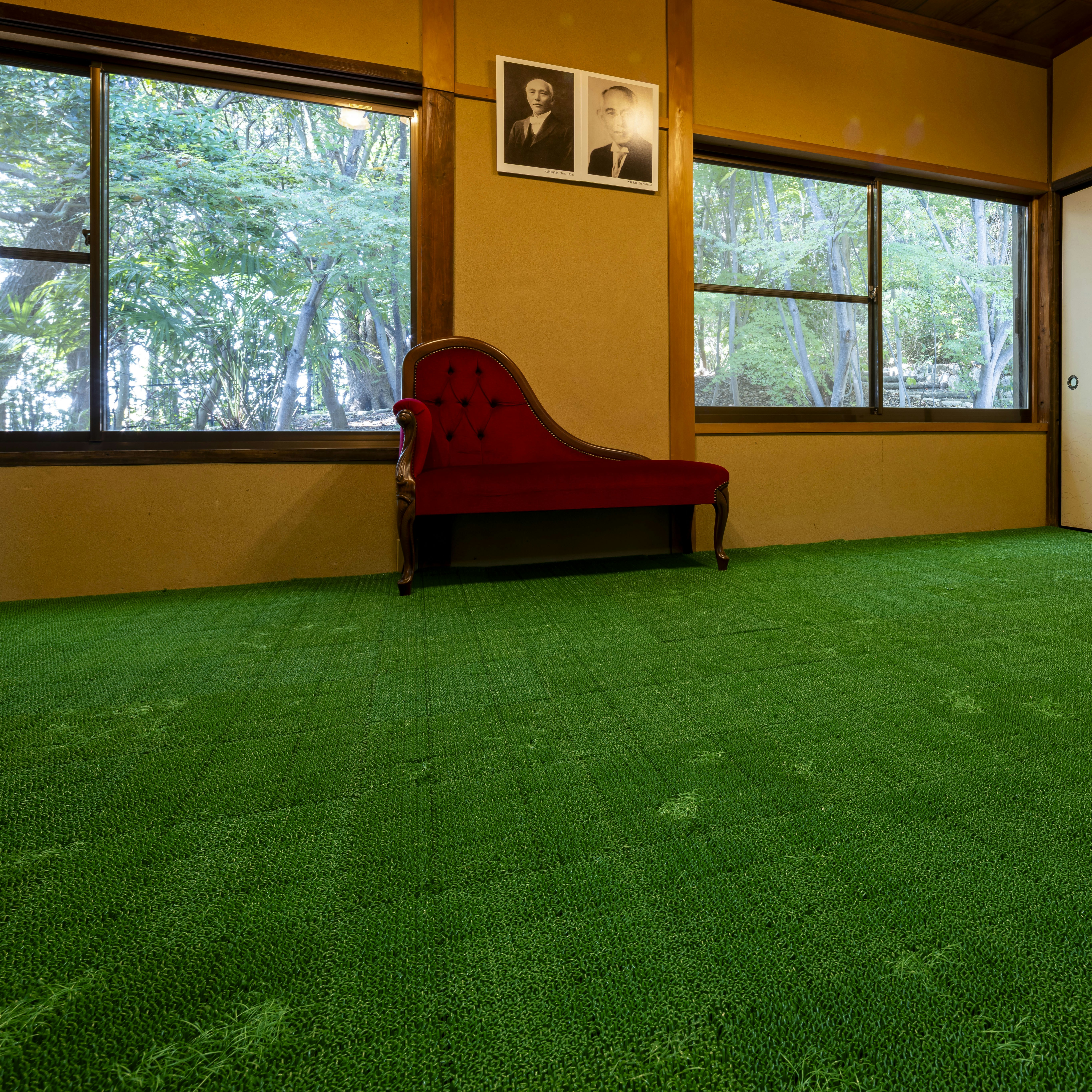 空をも見下ろす俯瞰した視点とは対照的に、床一面に人工芝が敷き詰められた空間では、来場者が床に這いつくばって芝を生育させる《常緑》(2004)が待っている。ペンチで人工芝を引き伸ばすことで、不揃いな「雑草」をつくり出していく。根本を掴み、ゆっくりと上に引っ張ることでビニール製の草が伸びる(途中で切れてしまったりもする)。手入れによって雑草が繁茂していくという、本来の庭仕事とは真逆のプロセスを経て、人工物はかえって「自然な」気配を帯びていく。どこか「噛み合わない」ユーモアに満ちた作品群は、心地よい違和感を伴いながら、見慣れた物事を捉え直す眼差しを与えてくれる。