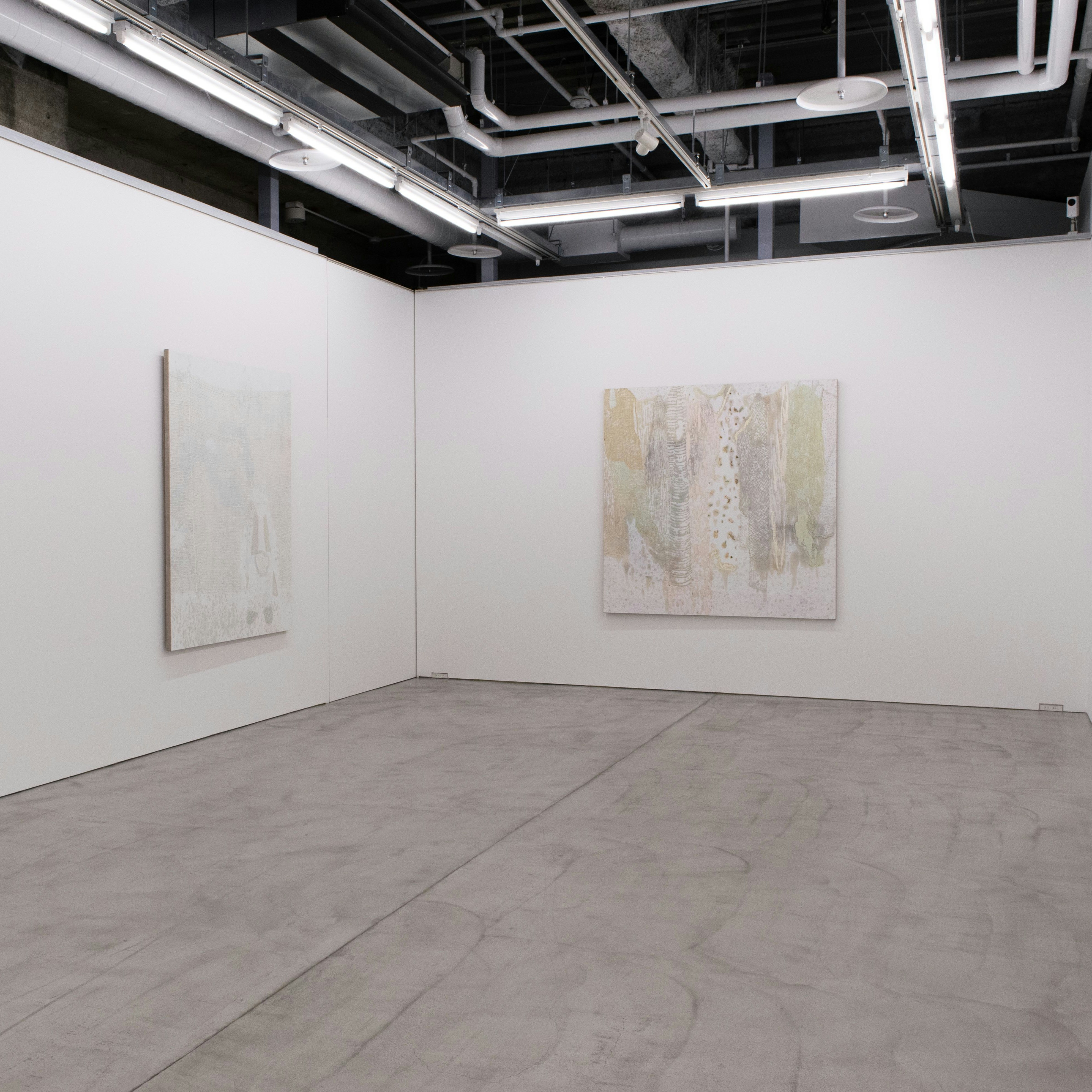 手塚は、絵画の制作過程で通常は塗りつぶされて消えてしまう下絵や下地層など、本来「見えなくなってしまうもの」の可視化をテーマとしている。その画面は、膠(にかわ)絵具で描かれた画面を下地材で一度まっさらに均し、その上から再び油彩を重ねる工程を経てつくり出される。下地層の白を基調とする手塚の絵画は、展示空間の白い壁面に溶け込むように朧げに存在しながら、その重層的なイメージを静かに主張していた。