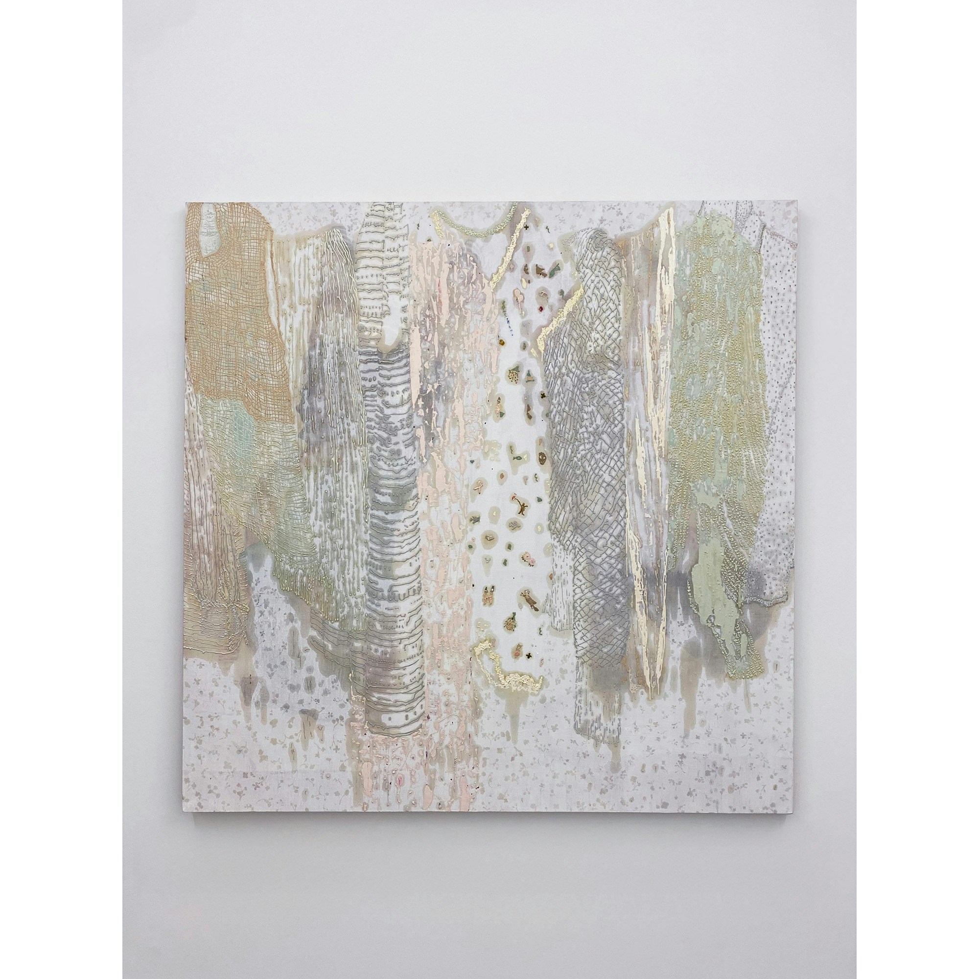 「層を重ね、線を引く」行為は、物事を二分する際につきまとう逡巡にも通じる。手塚の画面は、あえて「見えづらく」することで、揺らぐ心情や曖昧さをひとつの矩形のなかに封じ込めている。レイヤーの相互影響によって見え隠れするイメージを通じて、表面の背後にある内実や、見えないながらも確かに存在する層を丁寧に見つめ直すこととなった。