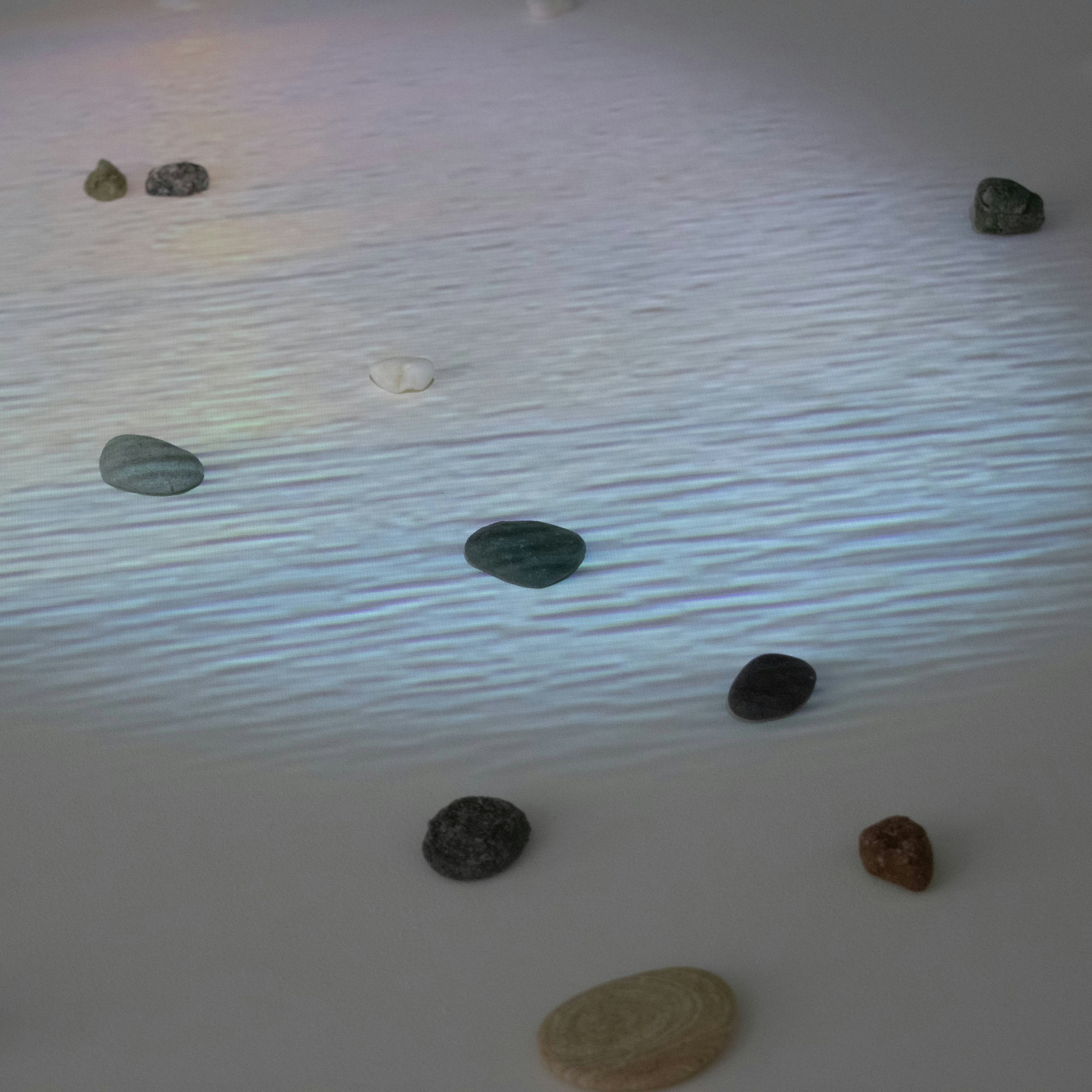 こうした「線引き」への関心は、触覚的な試みにも及んでいる。机の上に多数の小石が並べられた《生活の模倣(ものまね)》(2025)では、石鹸に彩色を施した「にせものの石」がいくつか混じっている。これらを識別する手立ては、実際に手に取った時の重さや肌触り、あるいは「水で濯ぐこと(溶けるか否か)」だ。天井から投影されたさざなみの映像は、この「濯ぐ」という行為を視覚的に示唆し、たとえ「表面」が似通っていても、事物の「内実」が決定的に異なることを提示していた。