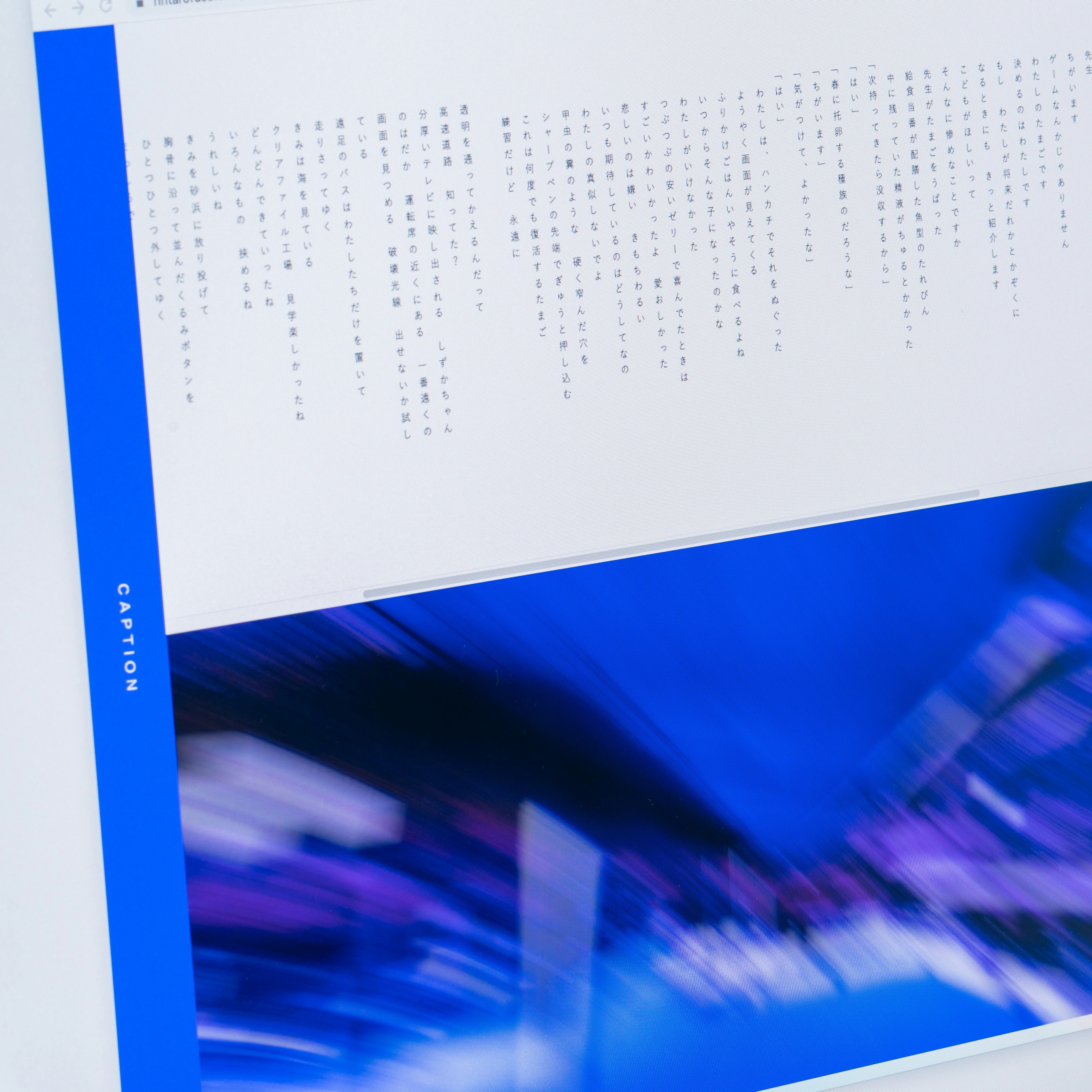 まず、ウェブサイトへアクセスするためのデバイスのディスプレイは、iPhoneやiPadをはじめとしたスマートフォンやタブレット端末の流通によって、そのサイズや縦横比、解像度が著しく多様化している。その結果、それぞれのデバイス毎にまったく異なるレイアウトで作品を組み立てる必要があった──近年標準的なレスポンシブウェブデザイン(*5)というものだ。そしてそれぞれのデバイスのために用意されたレイアウトに基づいて、ブラウザ上で映像と詩がレンダリングされる。
