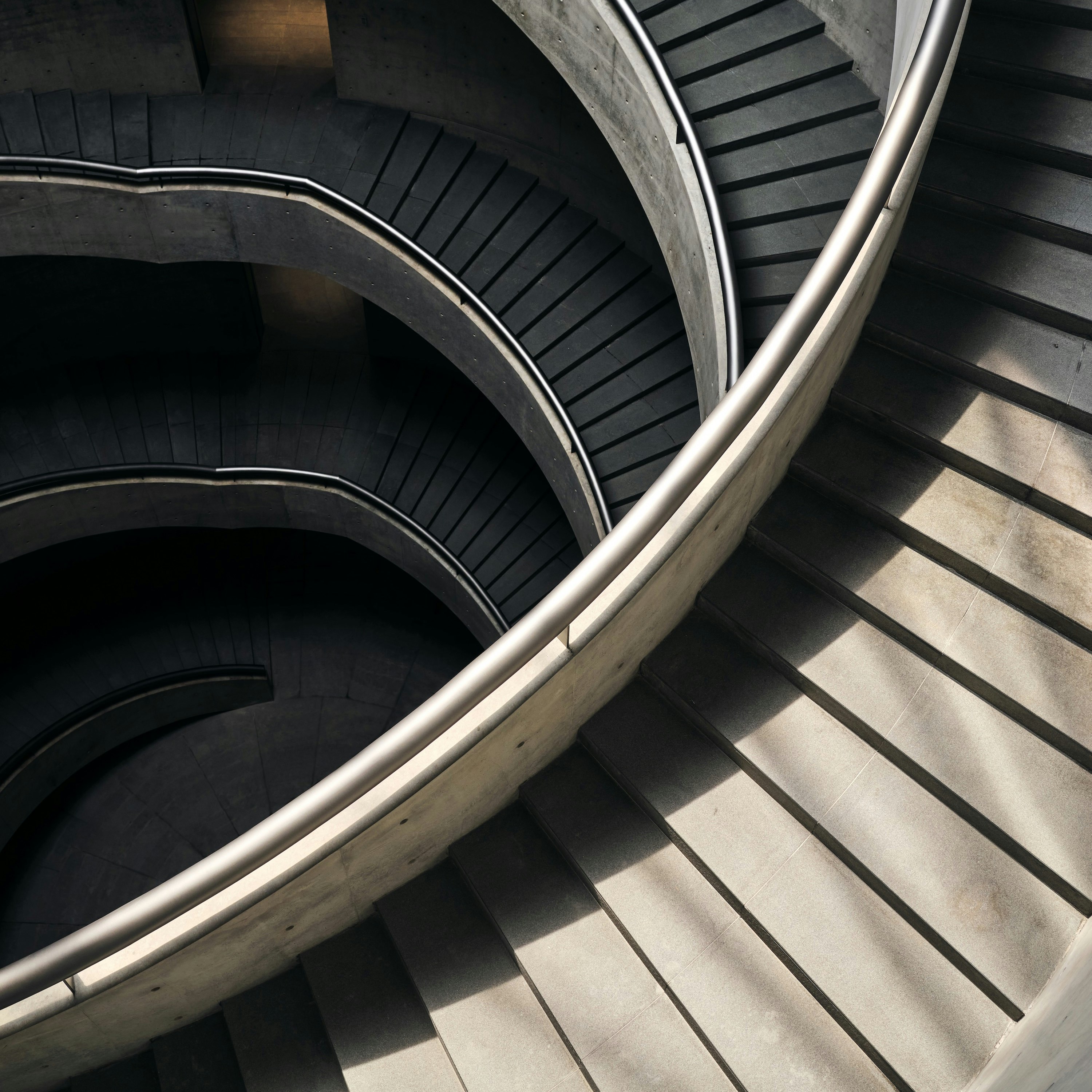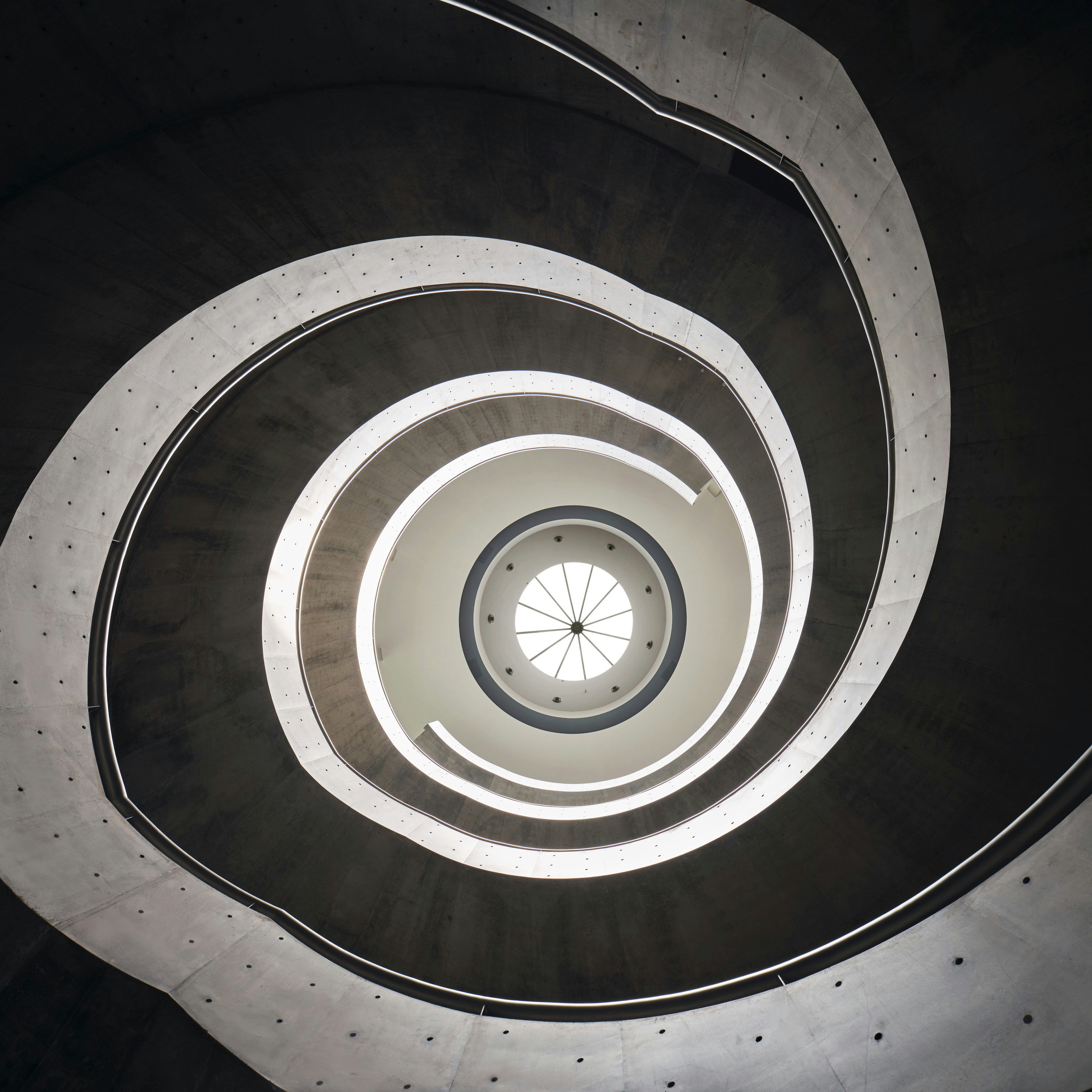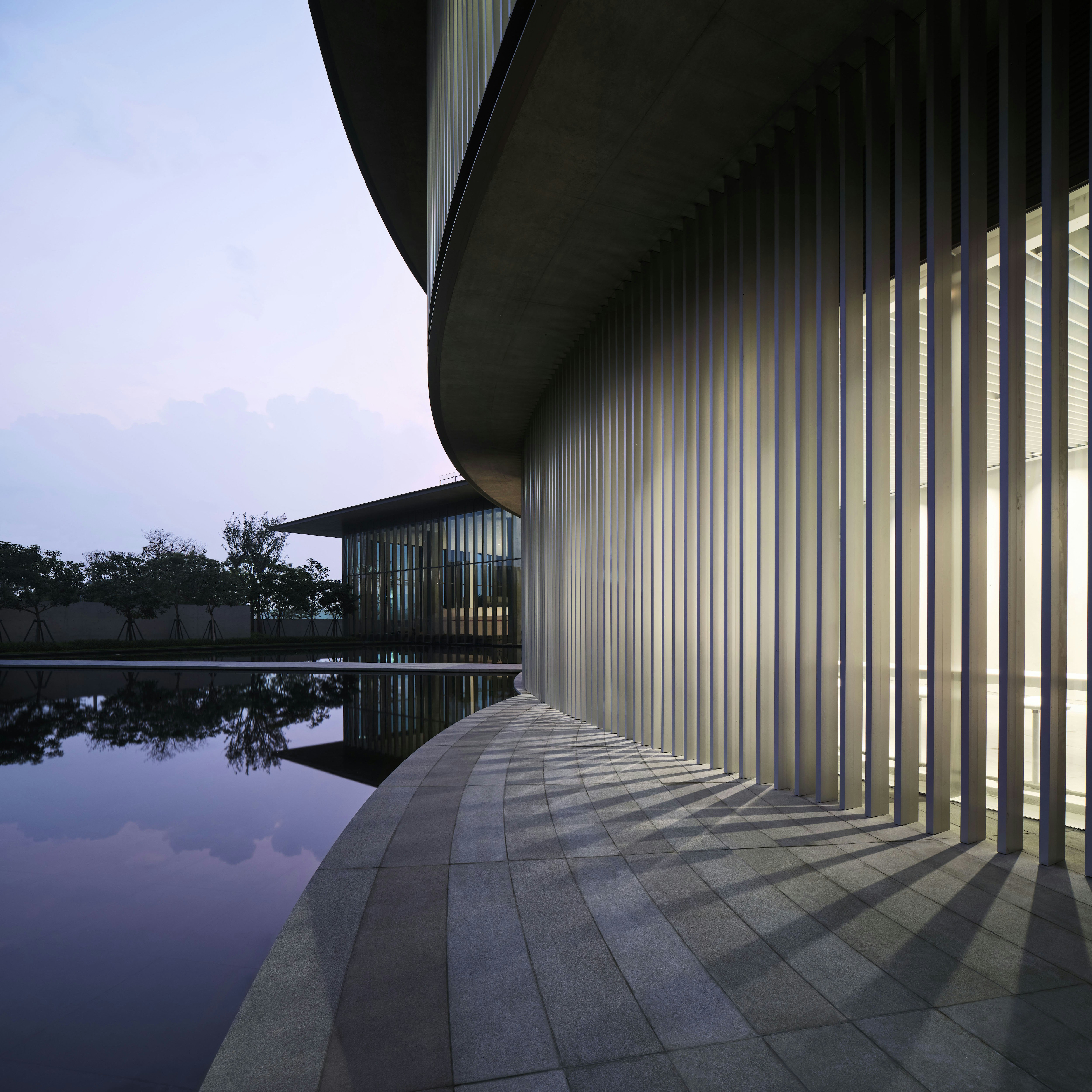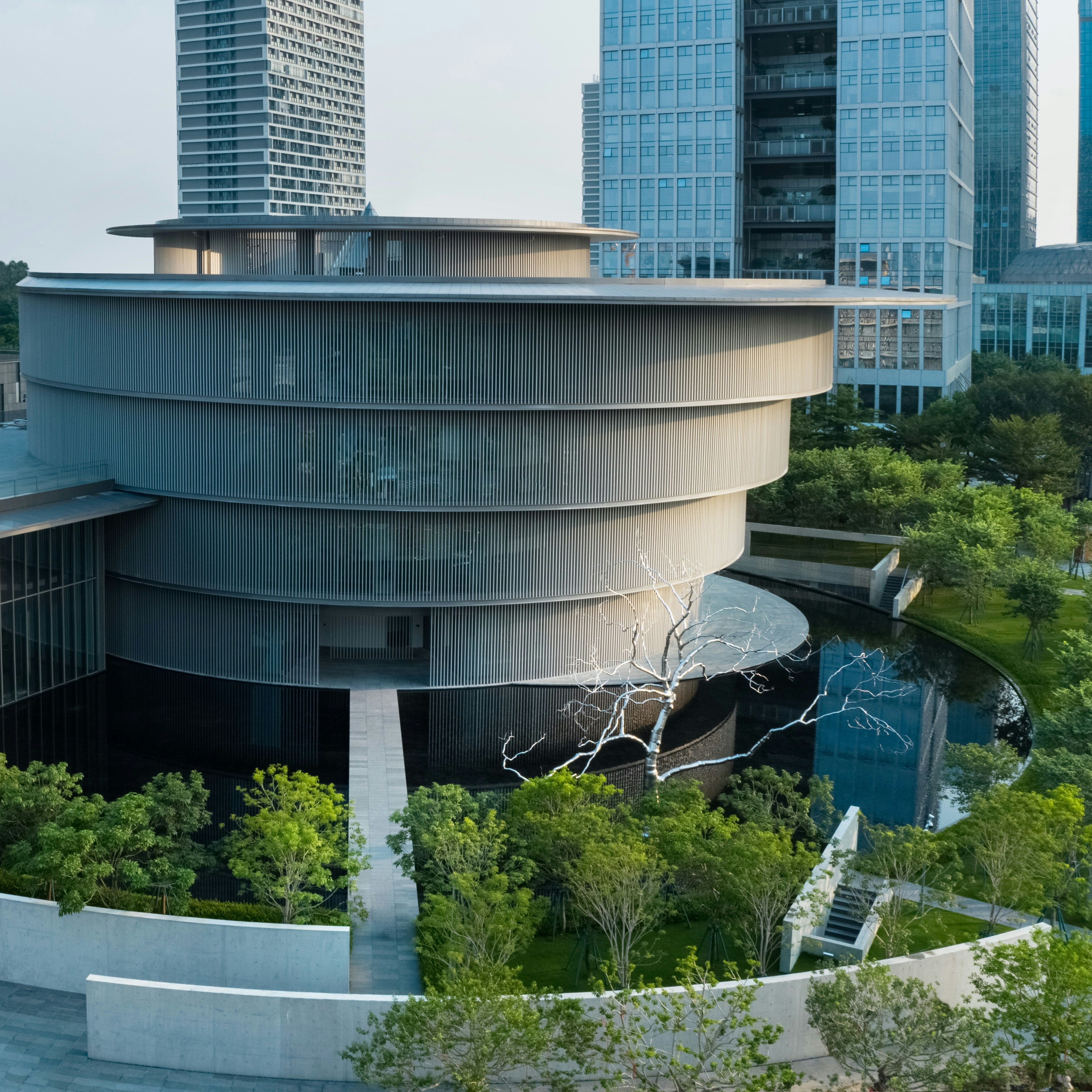 訪れてみると、Midea本社のビル群を背に、ニューヨークのグッゲンハイム美術館を思わせる竜巻のようなかたちが見えてきた。門をくぐると美しい水盤が広がり、静けさが降りてくる。建物の入り口へと続く橋が水盤の上をまっすぐに伸びている。都市の喧騒を離れて美の領界へと誘われる印象的なアプローチだ。箱型の展示室と、円形の展示室が組み合わさった構造で、円形部分は、先に触れたように上へ行くほど広くなる螺旋型建築になっている。円形の中央部には世界で初めて二重螺旋状に階段が取り付けられた。中央の天窓から入ってくる自然光が、時間帯によって表情を変えながら、この階段室をライトアップする。