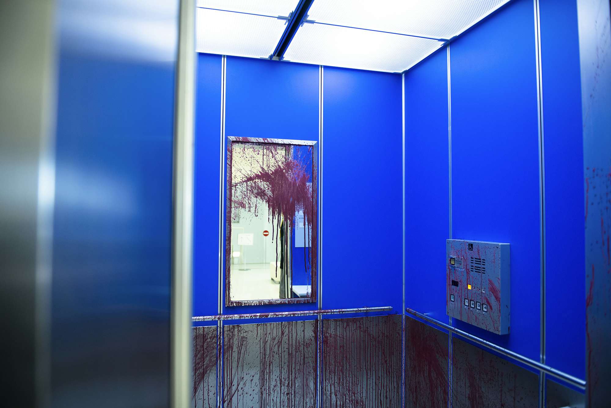 「恐怖の館」展で血塗りの演出が施されたエレベーター