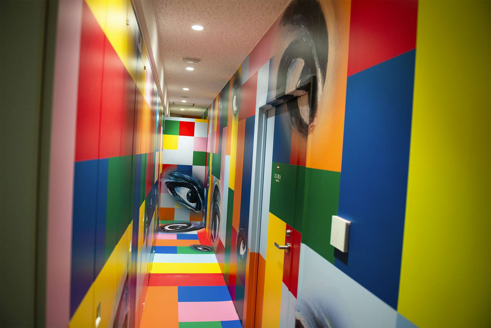 横尾忠則現代美術館の鏡張りの空間。ここからは横尾が新婚時代に暮らした街が見える