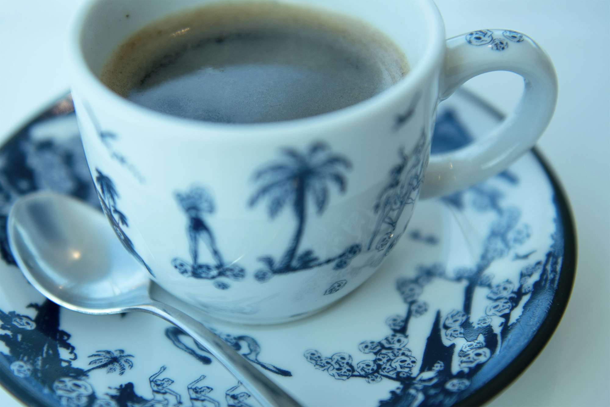 美術館に併設された「ぱんだかふぇ」では横尾デザインの食器でコーヒーや食事が楽しめる