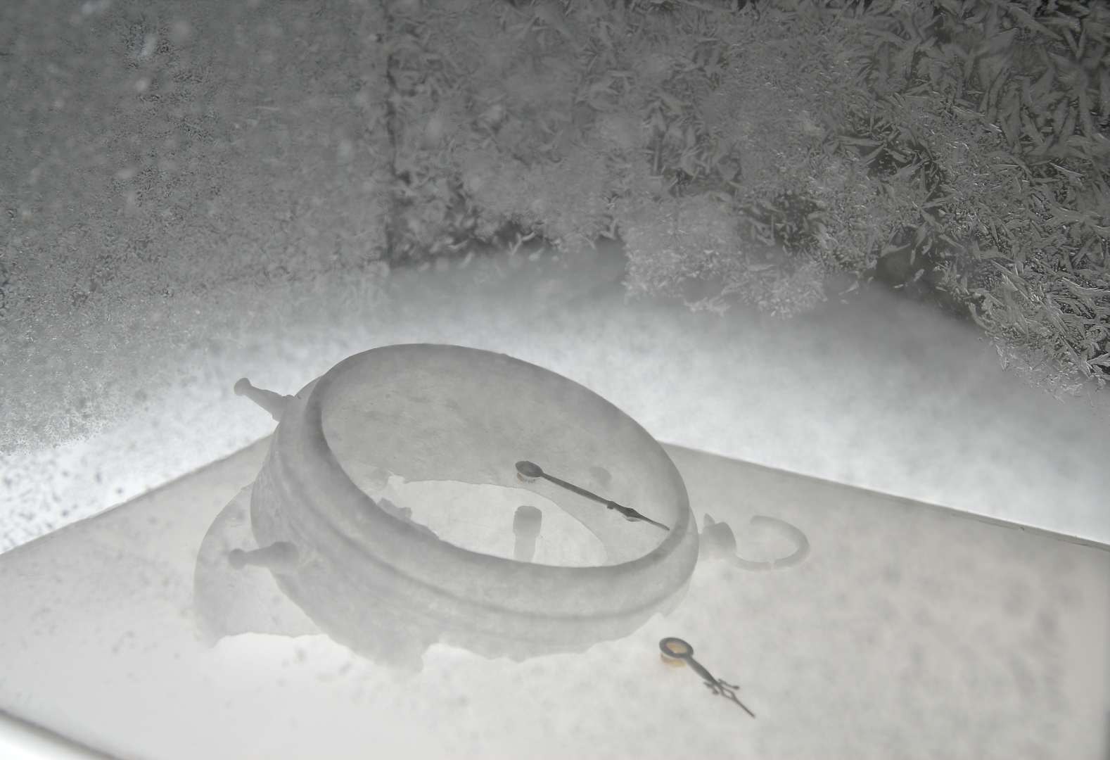 実家では茶箱の中に防虫剤を入れて服をしまっていました。衣替えのとき、その小さな袋に、かつてそこにあった丸い物質の痕跡が残されているのを見つけました。そこで時間が経つと姿を消す性質をもつナフタリンという素材を知り、当初は消えていくアートがあったらおもしろいと思ったのがきっかけでした。ただあるとき、できあがった作品をガラスケースに入れて展示したら、彫刻が消えていくにしたがって、ガラスケース内の表面に結晶が付着していきました。それは昇華したナフタリンが再び結晶化したもので、消えたものだと思っていたものは、じつは形を変えていただけで、そこにあり続けていたということに気づかされたのです。そうやって作品が形を変えてしまうことから、よく映像に残さないのかと聞かれることも多いのですが、映像になると、そこに始まりと終わりができてしまいます。本当の時間は始まりも終わりもなく、ただ流れていくもの。私の作品もまた、変容していく過程の中の一瞬に出会うことにこそ、意味があるのだと思っています。
