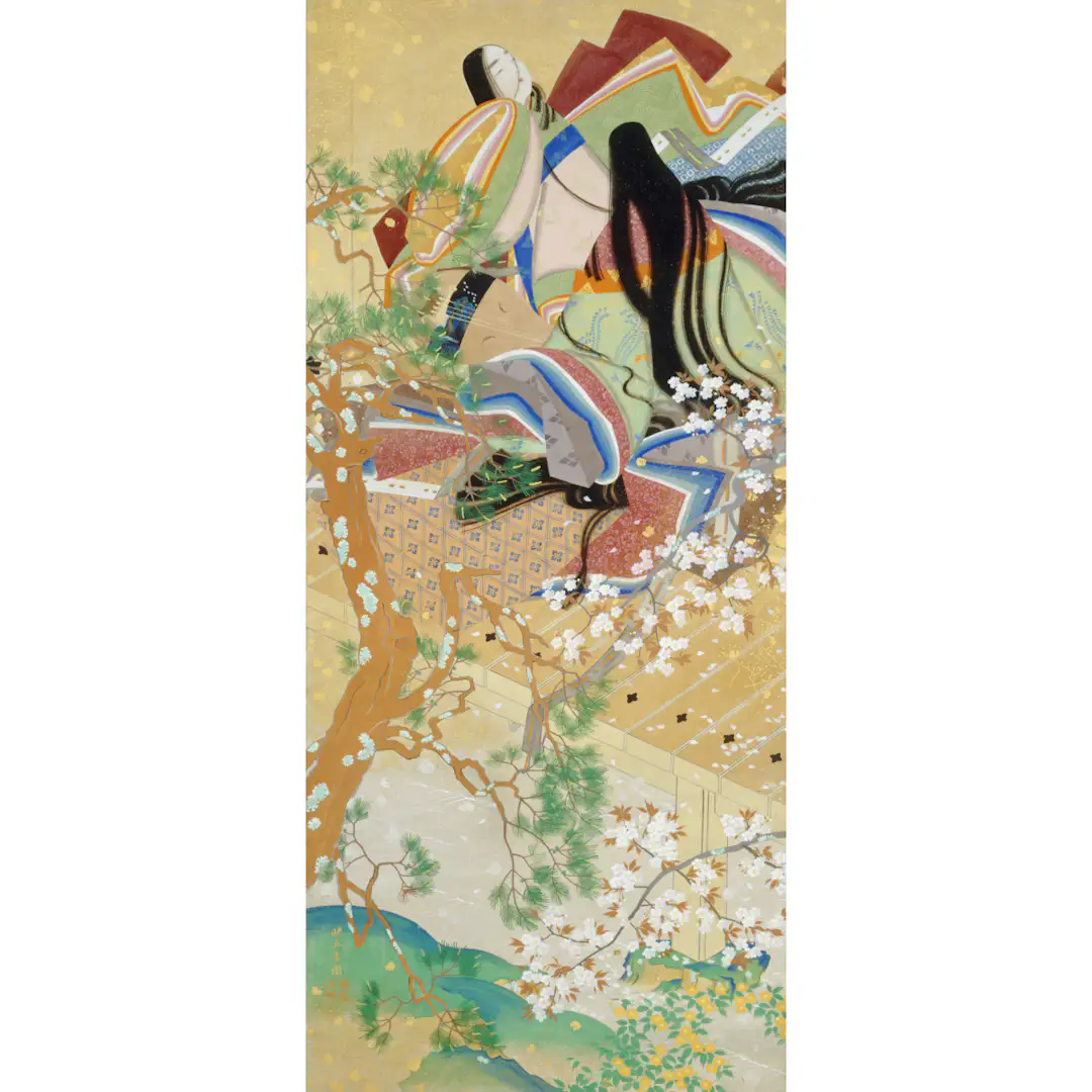 山崎 この《春光春衣》(1917)という作品では、十二単をまとった2人の女性が桜を眺めていますね。松岡映丘は「最後のやまと絵師」とも呼ばれている画家です。やまと絵とは、平安時代以降に発達した日本独自の絵画様式です。中国由来の唐絵に対して、やまと絵と呼ばれました。明治以降、様々な価値観が日本に入ってきて、やまと絵は下火になってしまうのですが、松岡映丘は平安・鎌倉の絵巻物などを研究し、やまと絵の再興に努めました。