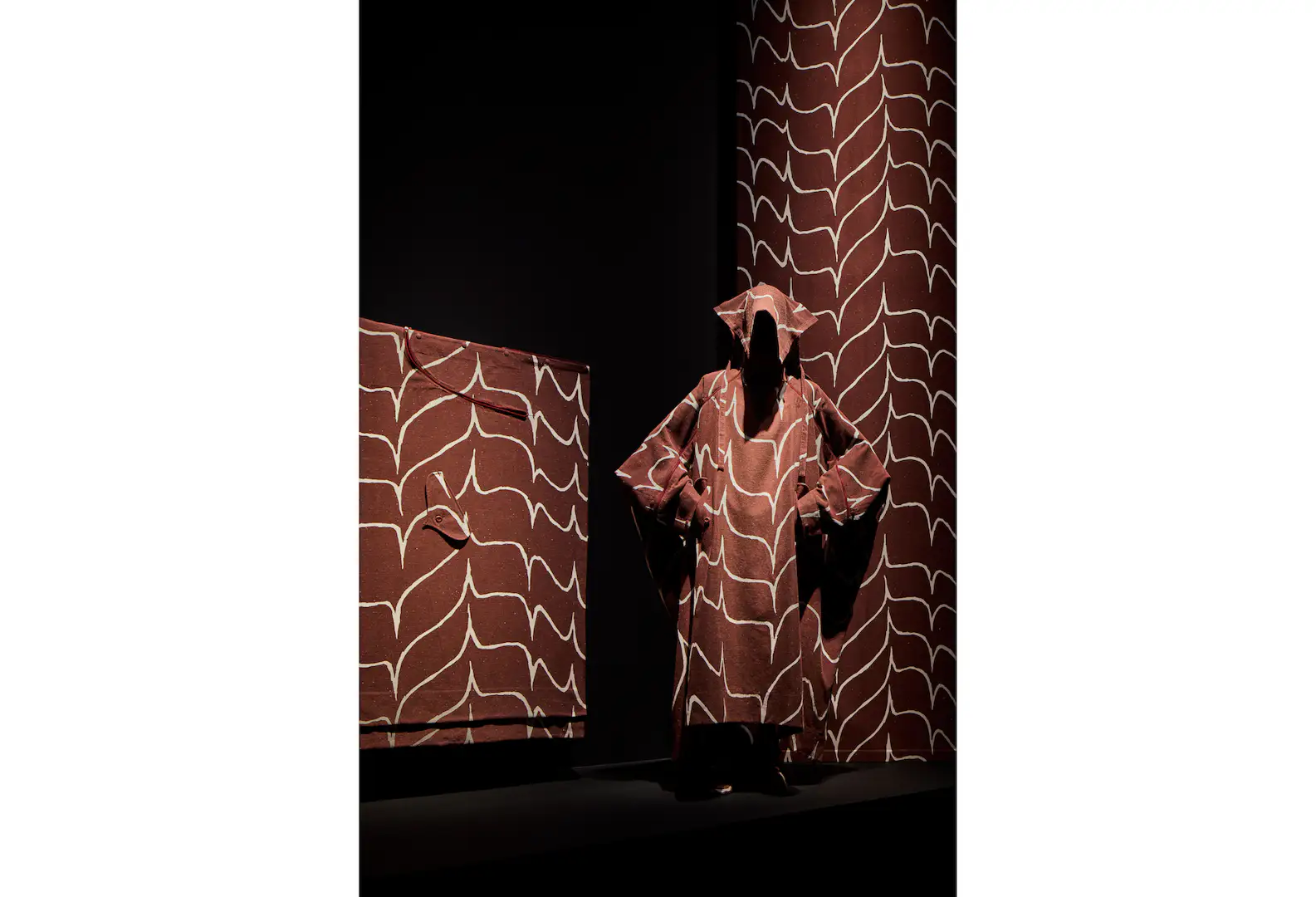 河原 加守田さんの作品をひと言で表すなら、私は「常軌を逸している」という言葉が相応しいと感じています。それほどまでに、怪しい」魅力に満ちたものをつくられている。いっぽうで、僕はその怪しさのなかに、抗いがたい美しさを感じました。今回のコレクションでは、その感覚をどうしても表現したいと考えました。例えば、入り口に展示されている《彩陶長方皿》(1971年)と、それに着想した《UROKOMON》は、初見では不気味に感じるかもしれません。しかし、気づけば何度も見てしまいたくなるような不思議な美しさがある。今回の展覧会では、加守田さんの作品と私たちの衣服を並べて展示することで、その独特の気配を提示したいと考えました。今回のコレクションでは、私なりにその「怪しい」ニュアンスを衣服として形にできたのではないかと自負しています。